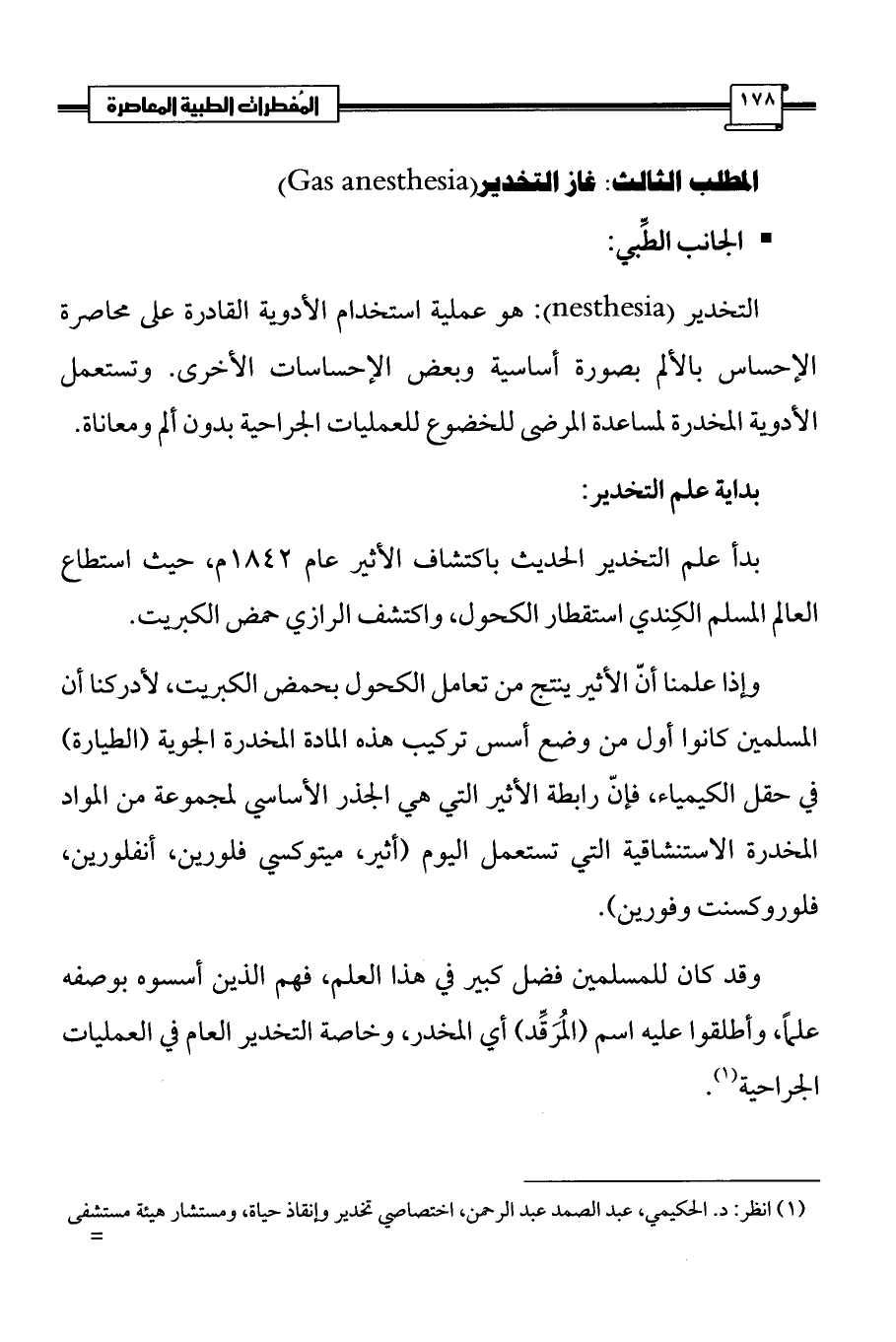(¬1) انظر: د. الحكيمي، عبد الصمد عبد الرحمن، اختصاصي تخدير وإنقاذ حياة، ومستشار هيئة مستشفى الثورة العام بصنعاء لشؤون الطوارئ وإنقاد الحياة، ومؤسس ومشرف مشروع الإنعاش القلبي الرئوي CPR ، علم التخدير والإنعاش علم عربي إسلامي، موقع صحة الطبي http://www.sehha.com، تاريخ التصفح، 23/ 3/2010 م وانظر: هونكة، زيغريد، شمس العرب تسطع على الغرب، ترجمة فاروق بيضون، وكمال الدسوقي، (بيروت: دار الجيل، ودار الآفاق الجديدة، الطبعة الثامنة، 1413 هـ- 1993 م) ص 280.