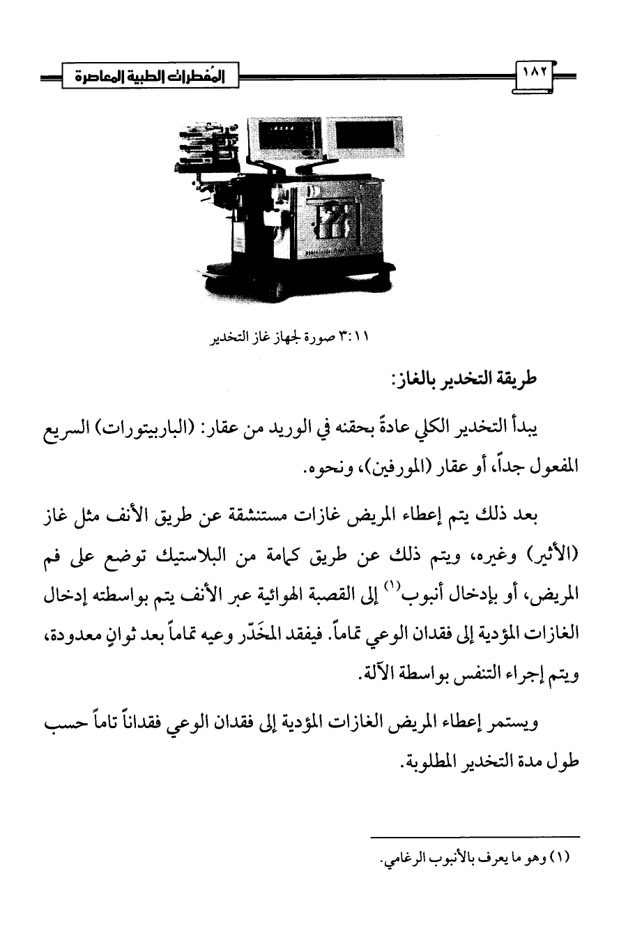 بعد ذلك يتم إعطاء المريض غازات مستنشقة عن طريق الأنف مثل غاز (الأثير) وغيره، ويتم ذلك عن طريق كمامة من البلاستيك توضع على فم المريض، أو بإدخال أنبوب (¬1) إلى القصبة الهوائية عبر الأنف يتم بواسطته إدخال الغازات المؤدية إلى فقدان الوعي تماماً. فيفقد المخَدّر وعيه تماماً بعد ثوانٍ معدودة، ويتم إجراء التنفس بواسطة الآلة.