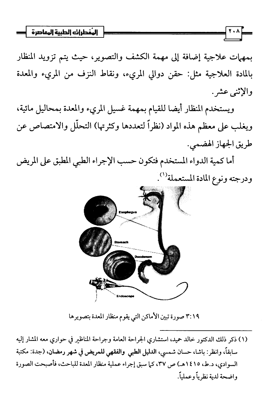 (¬1) ذكر ذلك الدكتور خالد حميد، استشاري الجراحة العامة وجراحة المناظير في حواري معه المشار إليه سابقاً، وانظر: باشا، حسان شمسي، الدليل الطبي والفقهي للمريض في شهر رمضان، (جدة: مكتبة السوادي، د. ط، 1415 هـ) ص 37، كما سبق إجراء عملية منظار المعدة للباحث، فأصبحت الصورة واضحة لدية نظرياً وعملياً.