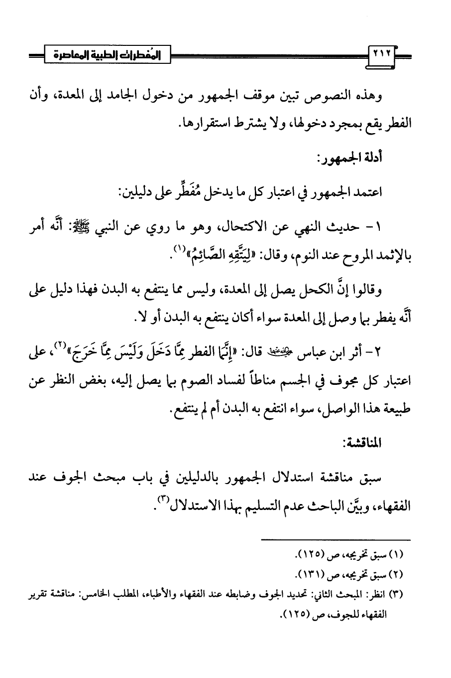 سبق مناقشة استدلال الجمهور بالدليلين في باب مبحث الجوف عند الفقهاء، وبيَّن الباحث عدم التسليم بهذا الاستدلال (¬3).