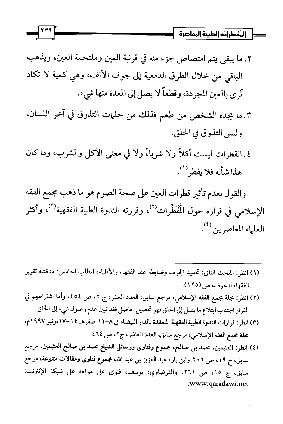 والقول بعدم تأثير قطرات العين على صحة الصوم هو ما ذهب مجمع الفقه الإسلامي في قراره حول المُفَطِّرات (¬2)، وقررته الندوة الطبية الفقهية (¬3)، وأكثر العلماء المعاصرين (¬4).