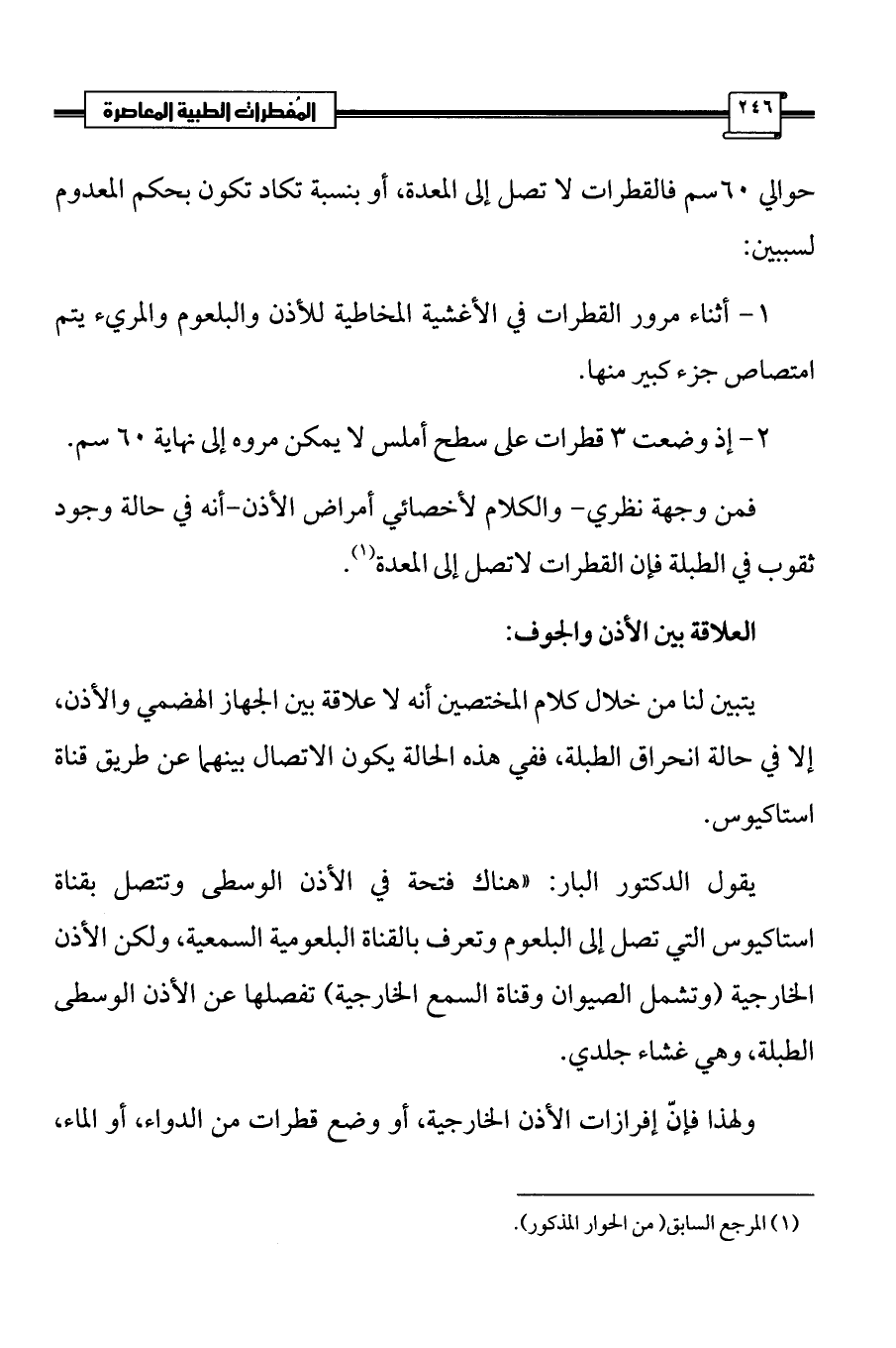 فمن وجهة نظري- والكلام لأخصائي أمراض الأذن-أنه في حالة وجود ثقوب في الطبلة فإن القطرات لاتصل إلى المعدة (¬1).