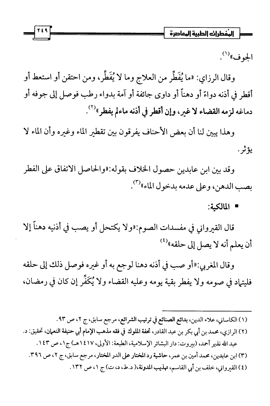 وقال الرزاي: «ما يُفَطِّر من العلاج وما لا يُفَطِّر، ومن احتقن أو استعط أو أقطر في أذنه دواءً أو دهناً أو داوى جائفة أو آمة بدواء رطب فوصل إلى جوفه أو دماغه لزمه القضاء لا غير، وإن أقطر في أذنه ماءلم يفطر» (¬2).