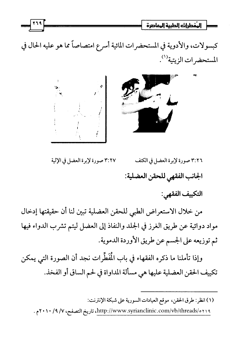 وإذا تأملنا ما ذكره الفقهاء في باب المُفَطِّرات نجد أن الصورة التي يمكن تكييف الحقن العضلية عليها هي مسألة المداواة في لحم الساق أو الفخذ.