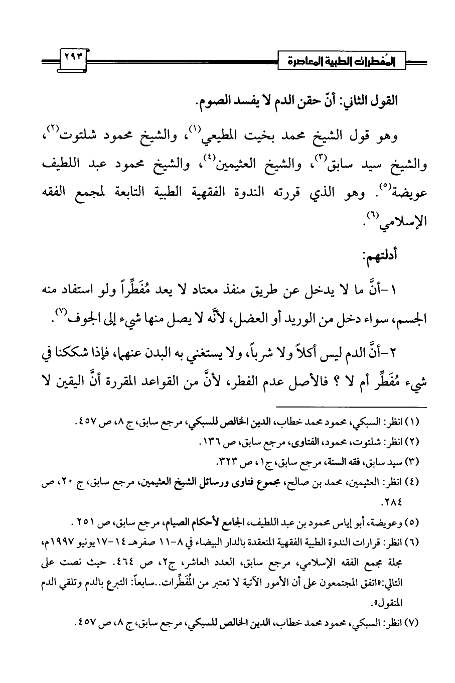 (¬6) انظر: قرارات الندوة الطبية الفقهية المنعقدة بالدار البيضاء في 8 - 11 صفرهـ 14 - 17 يونيو 1997 م، مجلة مجمع الفقه الإسلامي، مرجع سابق، العدد العاشر، ج 2، ص 464. حيث نصت على التالي: «اتفق المجتمعون على أن الأمور الآتية لا تعتبر من المُفَطِّرات .. سابعاً: التبرع بالدم وتلقي الدم المنقول».