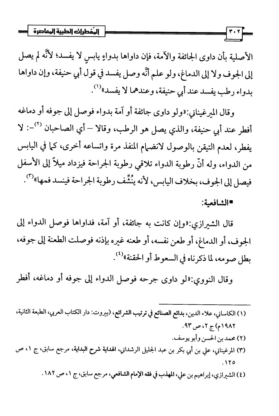 وقال الميرغيناني: «ولو داوى جائفة أو آمة بدواء فوصل إلى جوفه أو دماغه أفطر عند أبي حنيفة، والذي يصل هو الرطب، وقالا – أي الصاحبان (¬2) -: لا يفطر، لعدم التيقن بالوصول لانضمام المنفذ مرة واتساعه أخرى، كما في اليابس من الدواء، وله أنّ رطوبة الدواء تلاقي رطوبة الجراحة فيزداد ميلاً إلى الأسفل فيصل إلى الجوف، بخلاف اليابس، لأنه ينُشِّف رطوبة الجراحة فينسد فمها» (¬3).