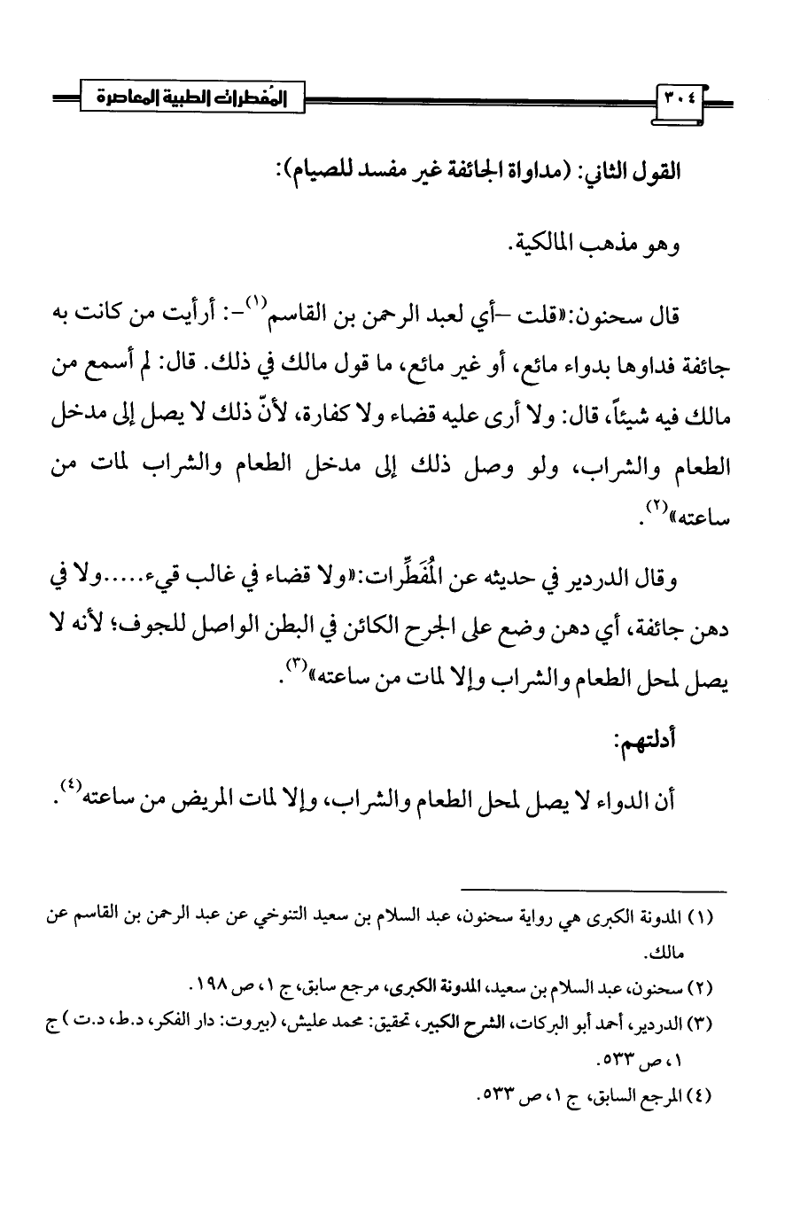 قال سحنون: «قلت –أي لعبد الرحمن بن القاسم (¬1) -: أرأيت من كانت به جائفة فداوها بدواء مائع، أو غير مائع، ما قول مالك في ذلك. قال: لم أسمع من مالك فيه شيئاً، قال: ولا أرى عليه قضاء ولا كفارة، لأنّ ذلك لا يصل إلى مدخل الطعام والشراب، ولو وصل ذلك إلى مدخل الطعام والشراب لمات من ساعته» (¬2).