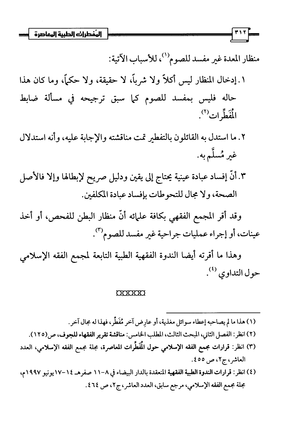 (¬3) انظر: قرارات مجمع الفقه الإسلامي حول المُفَطِّرات المعاصرة، مجلة مجمع الفقه الإسلامي، العدد العاشر، ج 2، ص 455.