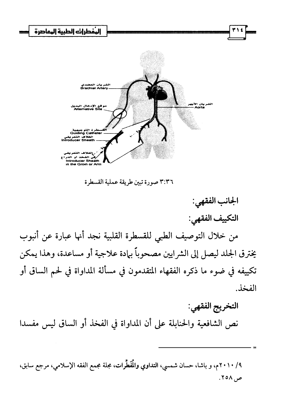 من خلال التوصيف الطبي للقسطرة القلبية نجد أنها عبارة عن أنبوب يخترق الجلد ليصل إلى الشرايين مصحوباً بمادة علاجية أو مساعدة، وهذا يمكن تكييفه في ضوء ما ذكره الفقهاء المتقدمون في مسألة المداواة في لحم الساق أو الفخذ.