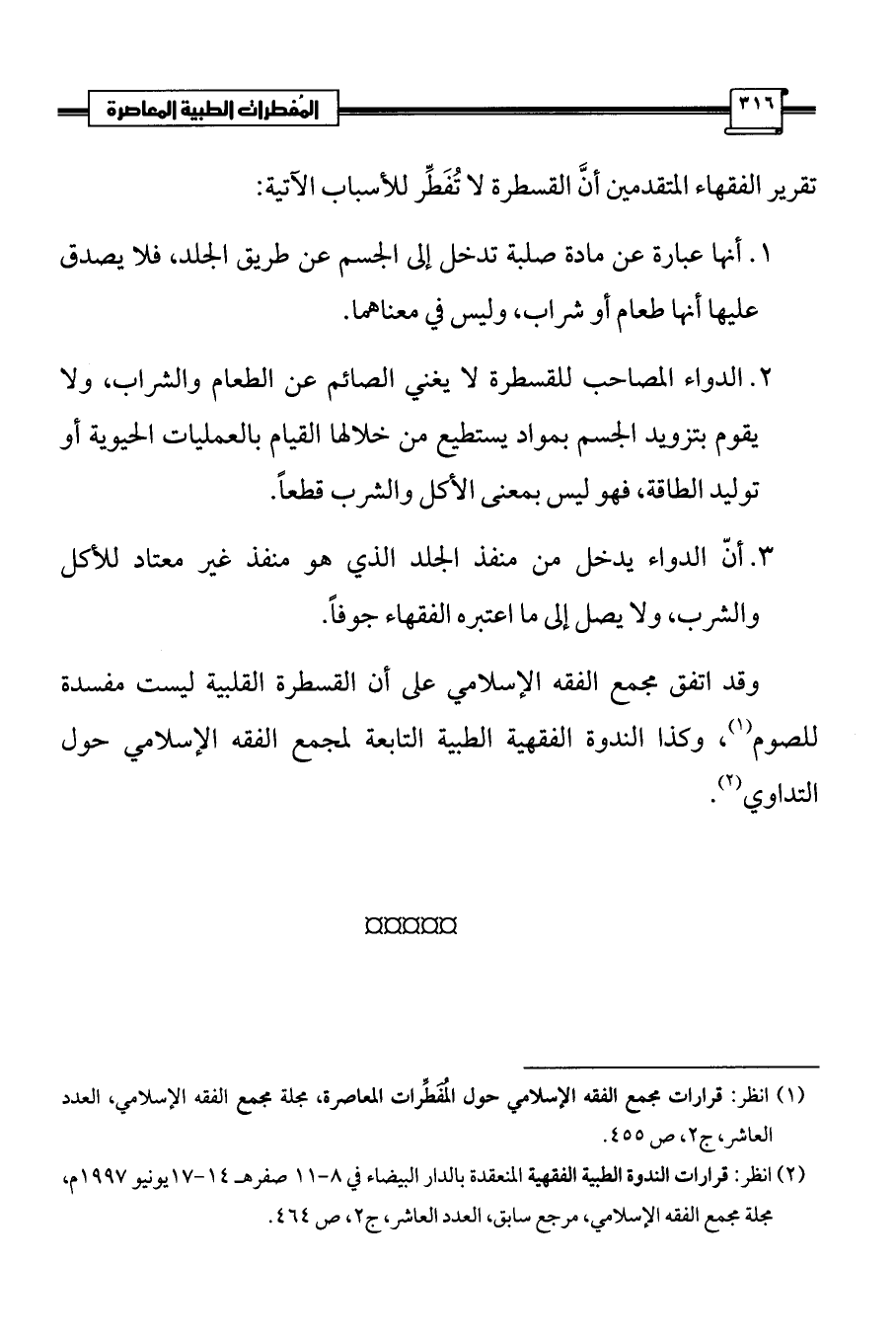 (¬1) انظر: قرارات مجمع الفقه الإسلامي حول المُفَطِّرات المعاصرة، مجلة مجمع الفقه الإسلامي، العدد العاشر، ج 2، ص 455.