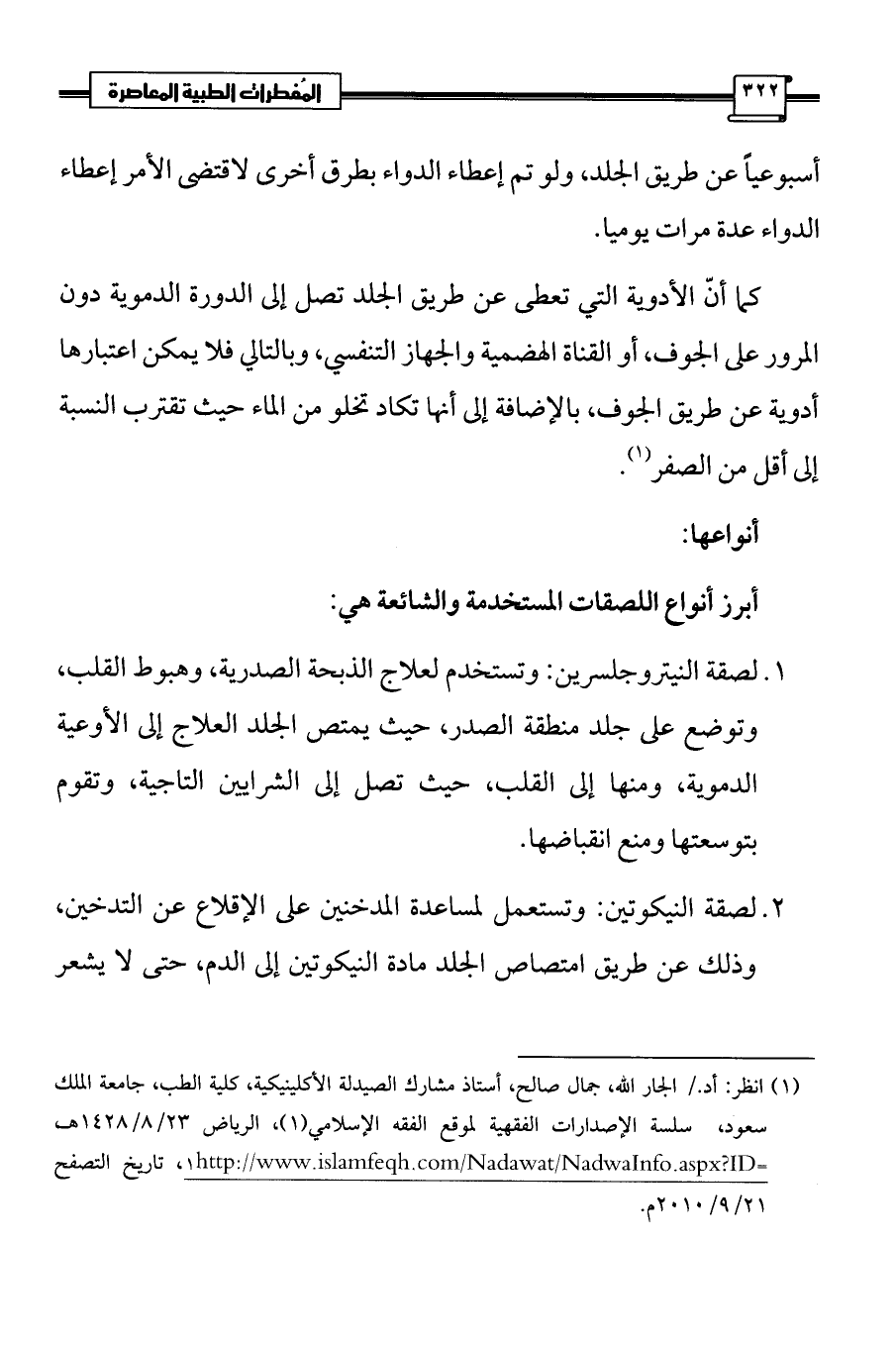 (¬1) انظر: أد./ الجار الله، جمال صالح، أستاذ مشارك الصيدلة الأكلينيكية، كلية الطب، جامعة الملك سعود، سلسة الإصدارات الفقهية لموقع الفقه الإسلامي (1)، الرياض 23/ 8/1428 هـ، http://www.islamfeqh.com/Nadawat/NadwaInfo.aspx?ID=1، تاريخ التصفح 21/ 9/2010 م.