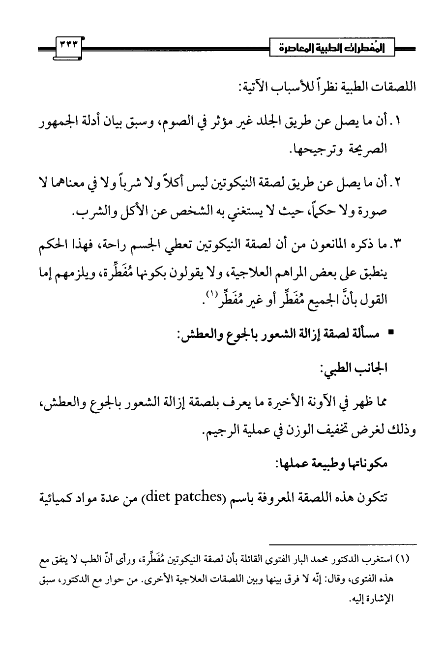 (¬1) استغرب الدكتور محمد البار الفتوى القائلة بأن لصقة النيكوتين مُفَطِّرة، ورأى أنّ الطب لا يتفق مع هذه الفتوى، وقال: إنّه لا فرق بينها وبين اللصقات العلاجية الأخرى. من حوار مع الدكتور، سبق الإشارة إليه.