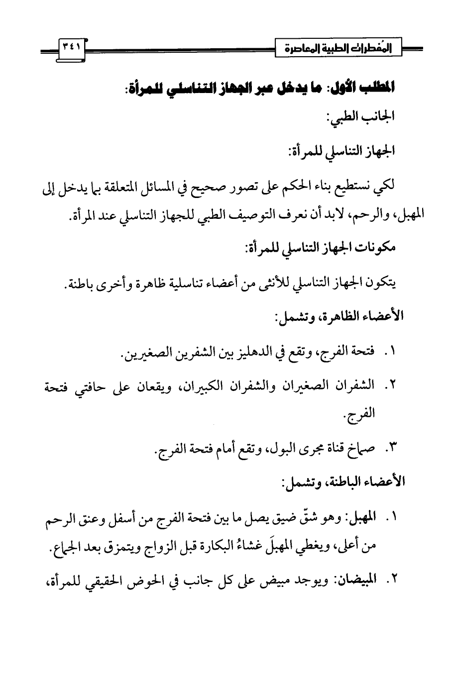 لكي نستطيع بناء الحكم على تصور صحيح في المسائل المتعلقة بما يدخل إلى المهبل، والرحم، لابد أن نعرف التوصيف الطبي للجهاز التناسلي عند المرأة.