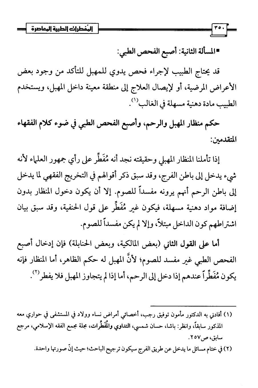 (¬1) أفادني به الدكتور مأمون توفيق رجب، أخصائي أمراض نساء وولاد في المستشفى في حواري معه المذكور سابقاً، وانظر: باشا، حسان شمسي، التداوي والمُفَطِّرات، مجلة مجمع الفقه الإسلامي، مرجع سابق، ص 257.