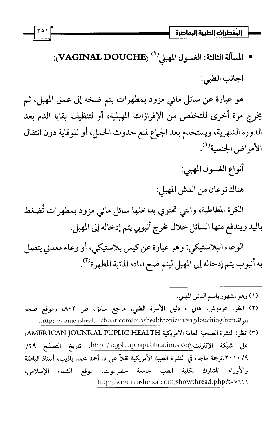 (¬2) انظر: عرموش، هاني، دليل الأسرة الطبي، مرجع سابق، ص 802، وموقع صحة المراة، http://womenshealth.about.com/cs/azhealthtopics/a/vagdouching.htm.