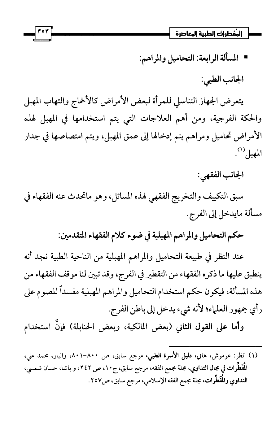 (¬1) انظر: عرموش، هاني، دليل الأسرة الطبي، مرجع سابق، ص 800 - 801، والبار، محمد علي، المُفَطِّرات في مجال التداوي، مجلة مجمع الفقه، مرجع سابق، ج 10، ص 242، وباشا، حسان شمسي، التداوي والمُفَطِّرات، مجلة مجمع الفقه الإسلامي، مرجع سابق، ص 257.
