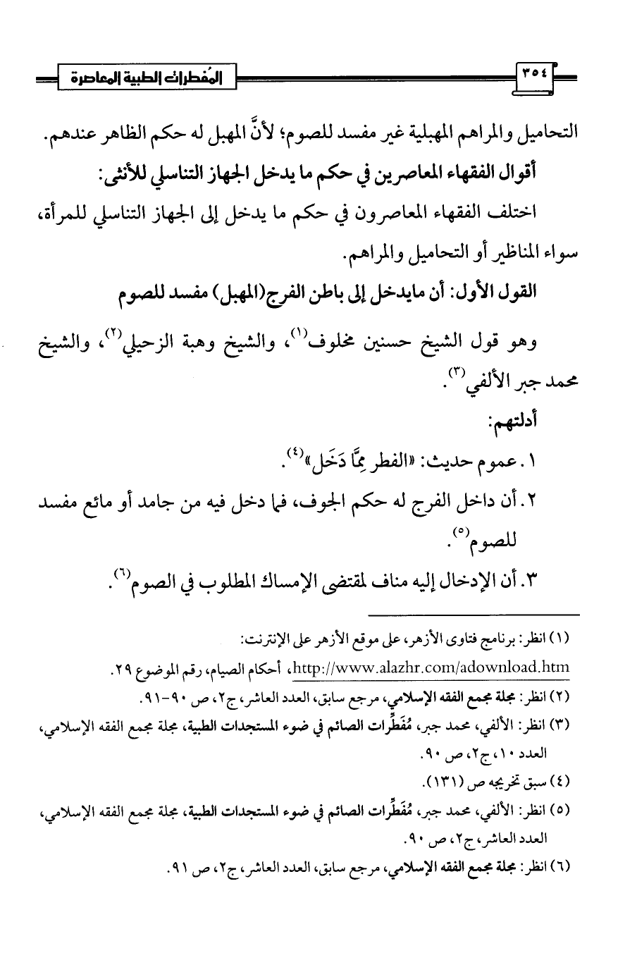 (¬3) انظر: الألفي، محمد جبر، مُفَطِّرات الصائم في ضوء المستجدات الطبية، مجلة مجمع الفقه الإسلامي، العدد 10، ج 2، ص 90.
