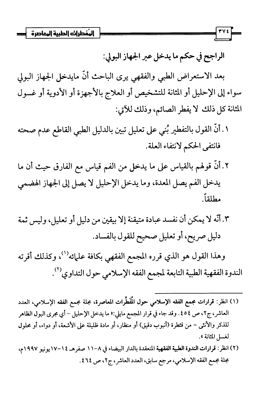 (¬1) انظر: قرارات مجمع الفقه الإسلامي حول المُفَطِّرات المعاصرة، مجلة مجمع الفقه الإسلامي، العدد العاشر، ج 2، ص 454. وقد جاء في قرار المجمع مايلي: «ما يدخل الإحليل - أي مجرى البول الظاهر للذكر والأنثى - من قثطرة (أنبوب دقيق) أو منظار، أو مادة ظليلة على الأشعة، أو دواء، أو محلول لغسل المثانة».