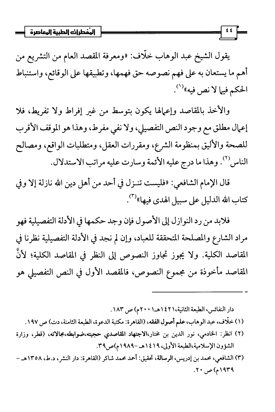 فلابد من رد النوازل إلى الأصول فإن وجد حكمها في الأدلة التفصيلية فهو مراد الشارع والمصلحة المتحققة للعباد، وإن لم نجد في الأدلة التفصيلية نظرنا في المقاصد الكلية. ولا يجوز تجاوز النصوص إلى النظر في المقاصد الكلية؛ لأنَّ المقاصد مأخوذة من مجموع النصوص، فالمقصد الأول في النص التفصيلي هو