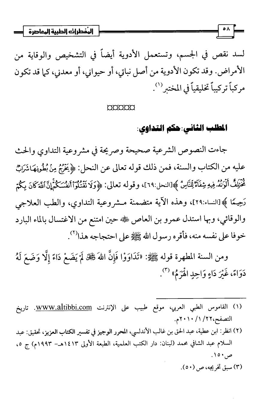 جاءت النصوص الشرعية صحيحة وصريحة في مشروعية التداوي والحث عليه من الكتاب والسنة، فمن ذلك قوله تعالى عن النحل: {يَخْرُجُ مِنْ بُطُونِهَا شَرَابٌ مُخْتَلِفٌ أَلْوَانُهُ فِيهِ شِفَاءٌ لِلنَّاسِ} [النحل:69]، وقوله تعالى: {وَلَا تَقْتُلُوا أَنْفُسَكُمْ إِنَّ اللَّهَ كَانَ بِكُمْ رَحِيمًا (29)} [النساء:29]، وهذه الآية متضمنة مشروعية التداوي، والطب العلاجي والوقائي، وبها استدل عمرو بن العاص - رضي الله عنه - حين امتنع من الاغتسال بالماء البارد خوفا على نفسه منه، فأقره رسول الله صلى الله عليه وسلم على احتجاجه هذا (¬2).