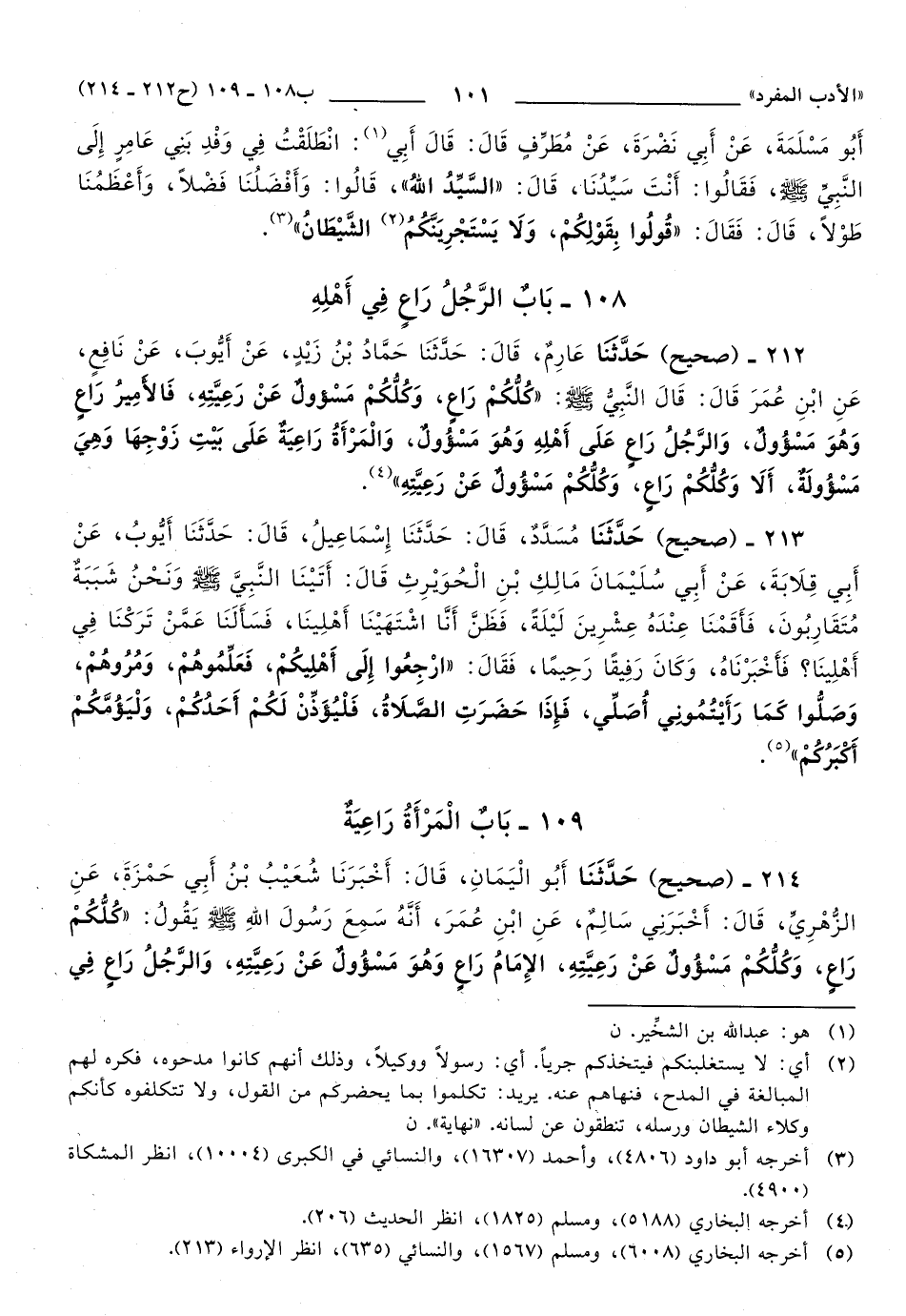 212 - حَدَّثَنَا عَارِمٌ، قَالَ: حَدَّثَنَا حَمَّادُ بْنُ زَيْدٍ، عَنْ أَيُّوبَ، عَنْ نَافِعٍ، عَنِ ابْنِ عُمَرَ, قَالَ: قَالَ النَّبِيُّ صَلَّى اللهُ عَلَيهِ وَسَلَّمَ: كُلُّكُمْ رَاعٍ، وَكُلُّكُمْ مَسْؤولٌ عَنْ رَعِيَّتِهِ، فَالأَمِيرُ رَاعٍ وَهُوَ مَسْؤُولٌ، وَالرَّجُلُ رَاعٍ عَلَى أَهْلِهِ وَهُوَ مَسْؤُولٌ، وَالْمَرْأَةُ رَاعِيَةٌ عَلَى بَيْتِ زَوْجِهَا وَهِيَ مَسْؤُولَةٌ، أَلاَ وَكُلُّكُمْ رَاعٍ، وَكُلُّكُمْ مَسْؤُولٌ عَنْ رَعِيَّتِهِ.