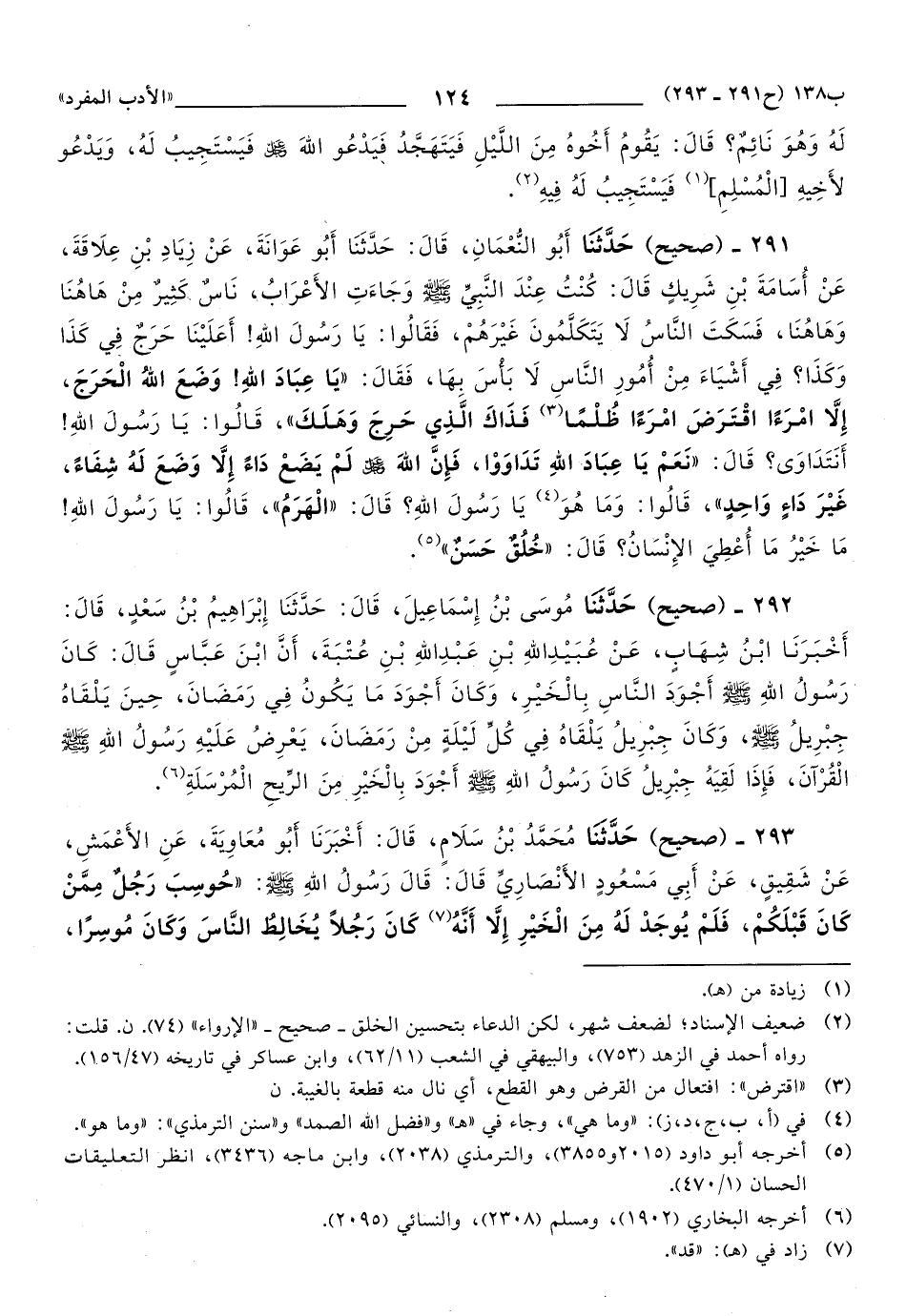 291 - حَدَّثَنَا أَبُو النُّعْمَانِ، قَالَ: حَدَّثَنَا أَبُو عَوَانَةَ، عَنْ زِيَادِ بْنِ عِلاَقَةَ، عَنْ أُسَامَةَ بْنِ شَرِيكٍ, قَالَ: كُنْتُ عِنْدَ النَّبِيِّ صَلَّى اللهُ عَلَيهِ وَسَلَّمَ وَجَاءَتِ الأَعْرَابُ، نَاسٌ كَثِيرٌ مِنْ هَاهُنَا وَهَاهُنَا، فَسَكَتَ النَّاسُ لاَ يَتَكَلَّمُونَ غَيْرَهُمْ، فَقَالُوا: يَا رَسُولَ اللهِ، أَعَلَيْنَا حَرَجٌ فِي كَذَا وَكَذَا؟ فِي أَشْيَاءَ مِنْ أُمُورِ النَّاسِ، لاَ بَأْسَ بِهَا، فَقَالَ: يَا عِبَادَ اللهِ! وَضَعَ اللهُ الْحَرَجَ، إِلاَّ امْرَءًا اقْتَرَضَ امْرَءًا ظُلْمًا, فَذَاكَ الَّذِي حَرِجَ وَهَلَكَ، قَالُوا: يَا رَسُولَ اللهِ!، أَنَتَدَاوَى؟ قَالَ: نَعَمْ, يَا عِبَادَ اللهِ تَدَاوَوْا، فَإِنَّ اللهَ عَزَّ وَجَلَّ لَمْ يَضَعْ دَاءً إِلاَّ وَضَعَ لَهُ شِفَاءً، غَيْرَ دَاءٍ وَاحِدٍ، قَالُوا: وَمَا هُوَ يَا رَسُولَ اللهِ؟ قَالَ: الْهِرَمَ، قَالُوا: يَا رَسُولَ اللهِ! مَا خَيْرُ مَا أُعْطِيَ الإِنْسَانُ؟ قَالَ: خُلُقٌ حَسَنٌ.