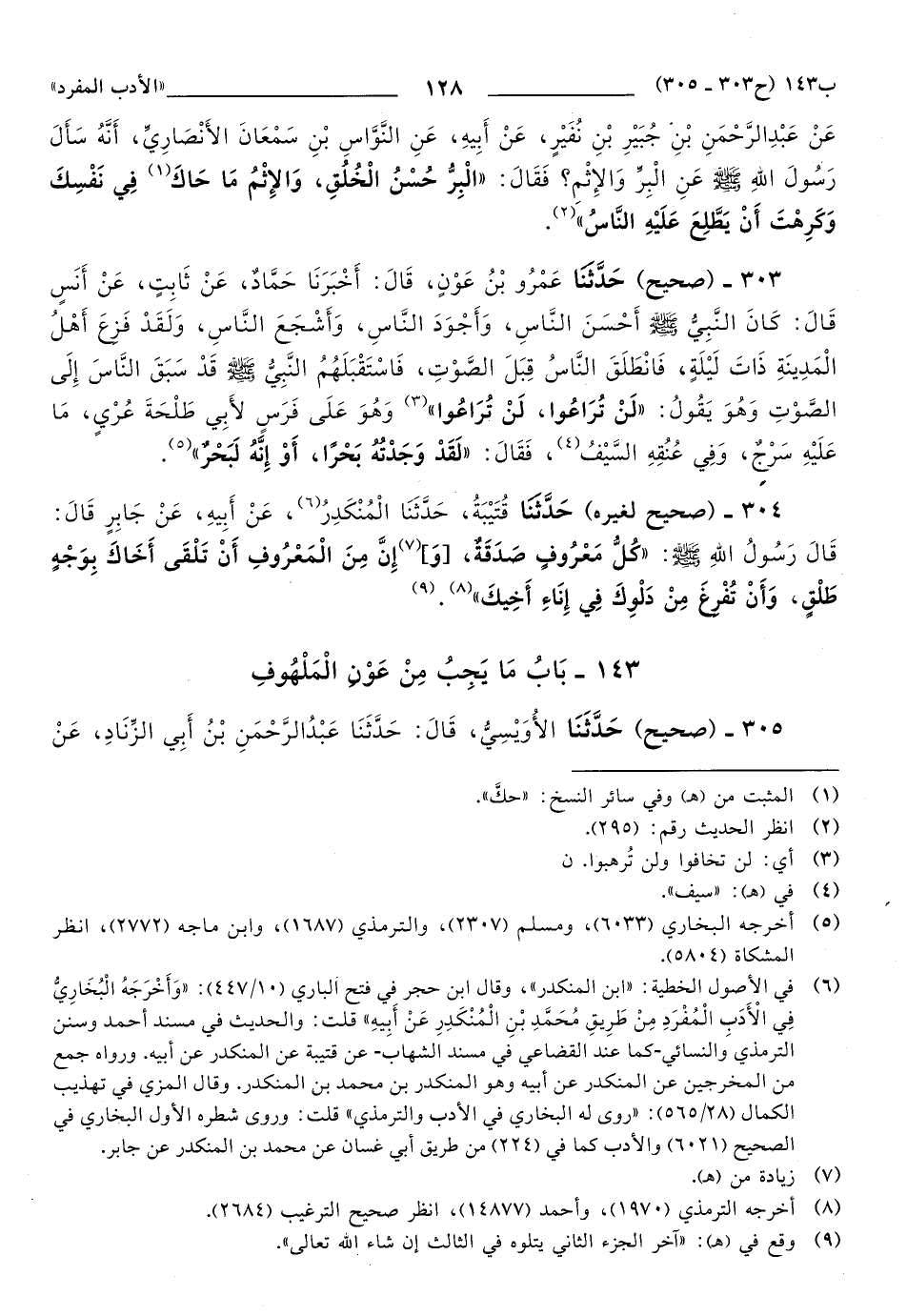 304 - حَدَّثَنَا قُتَيْبَةُ، حَدَّثَنَا الْمُنْكَدِرِ (1)، عَنْ أَبِيهِ، عَنْ جَابِرٍ, قَالَ: قَالَ رَسُولُ اللهِ صَلَّى اللهُ عَلَيهِ وَسَلَّمَ: كُلُّ مَعْرُوفٍ صَدَقَةٌ، [و] (2) إِنَّ مِنَ الْمَعْرُوفِ أَنْ تَلْقَى أَخَاكَ بِوَجْهٍ طَلْقٍ، وَأَنْ تُفْرِغَ مِنْ دَلْوِكَ فِي إِنَاءِ أَخِيكَ.