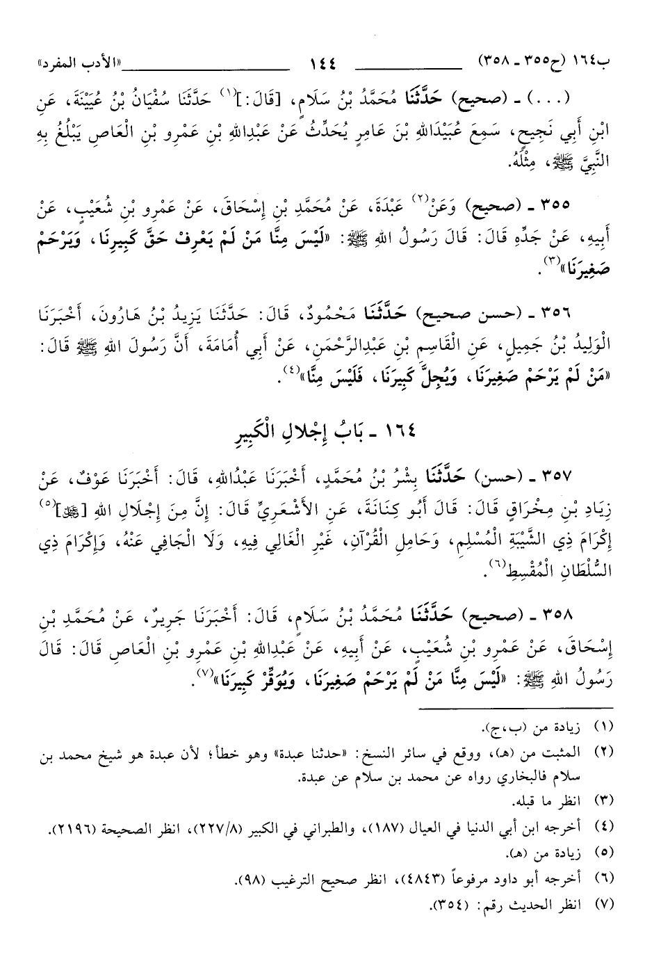 358 - حَدَّثَنَا مُحَمَّدُ بْنُ سَلاَمٍ، قَالَ: أَخْبَرَنَا جَرِيرٌ، عَنْ مُحَمَّدِ بْنِ إِسْحَاقَ، عَنْ عَمْرِو بْنِ شُعَيْبٍ، عَنْ أَبِيهِ، عَنْ عَبْدِ اللهِ بْنِ عَمْرِو بْنِ الْعَاصِ, قَالَ: قَالَ رَسُولُ اللهِ صَلَّى اللهُ عَلَيهِ وَسَلَّمَ: لَيْسَ مِنَّا مَنْ لَمْ يَرْحَمْ صَغِيرَنَا، وَيُوَقِّرْ كَبِيرَنَا.