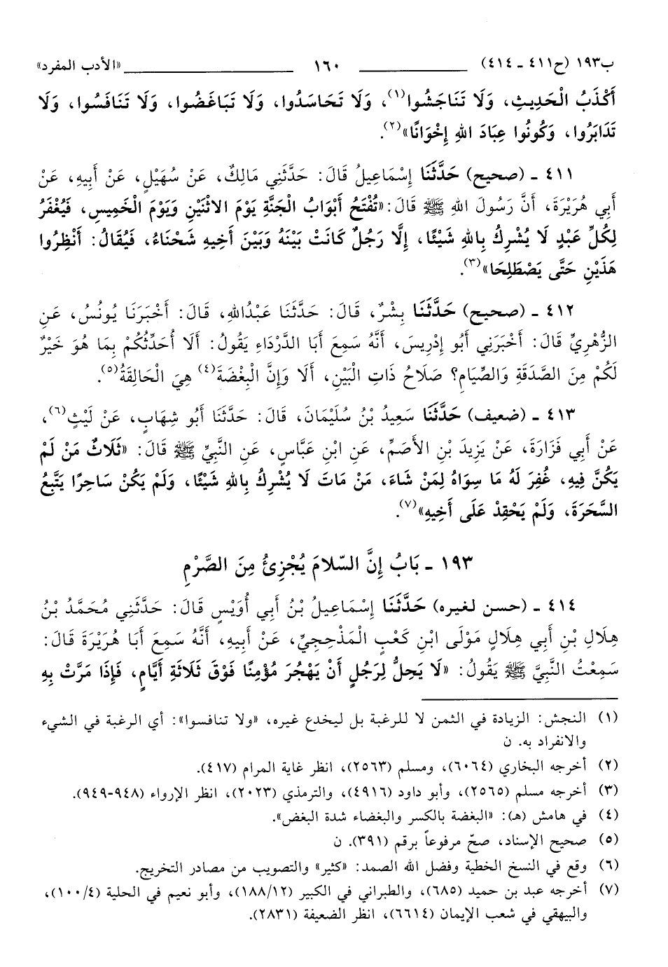 411 - حَدَّثَنَا إِسْمَاعِيلُ, قَالَ: حَدَّثَنِي مَالِكٌ، عَنْ سُهَيْلٍ، عَنْ أَبِيهِ، عَنْ أَبِي هُرَيْرَةَ، أَنَّ رَسُولَ اللهِ صَلَّى اللهُ عَلَيهِ وَسَلَّمَ قَالَ: تُفْتَحُ أَبْوَابُ الْجَنَّةِ يَوْمَ الاثْنَيْنِ وَيَوْمَ الْخَمِيسِ، فَيُغْفَرُ لِكُلِّ عَبْدٍ لاَ يُشْرِكُ بِاللهِ شَيْئًا، إِلاَّ رَجُلٌ كَانَتْ بَيْنَهُ وَبَيْنَ أَخِيهِ شَحْنَاءُ، فَيُقَالُ: أَنْظِرُوا هَذَيْنِ حَتَّى يَصْطَلِحَا.