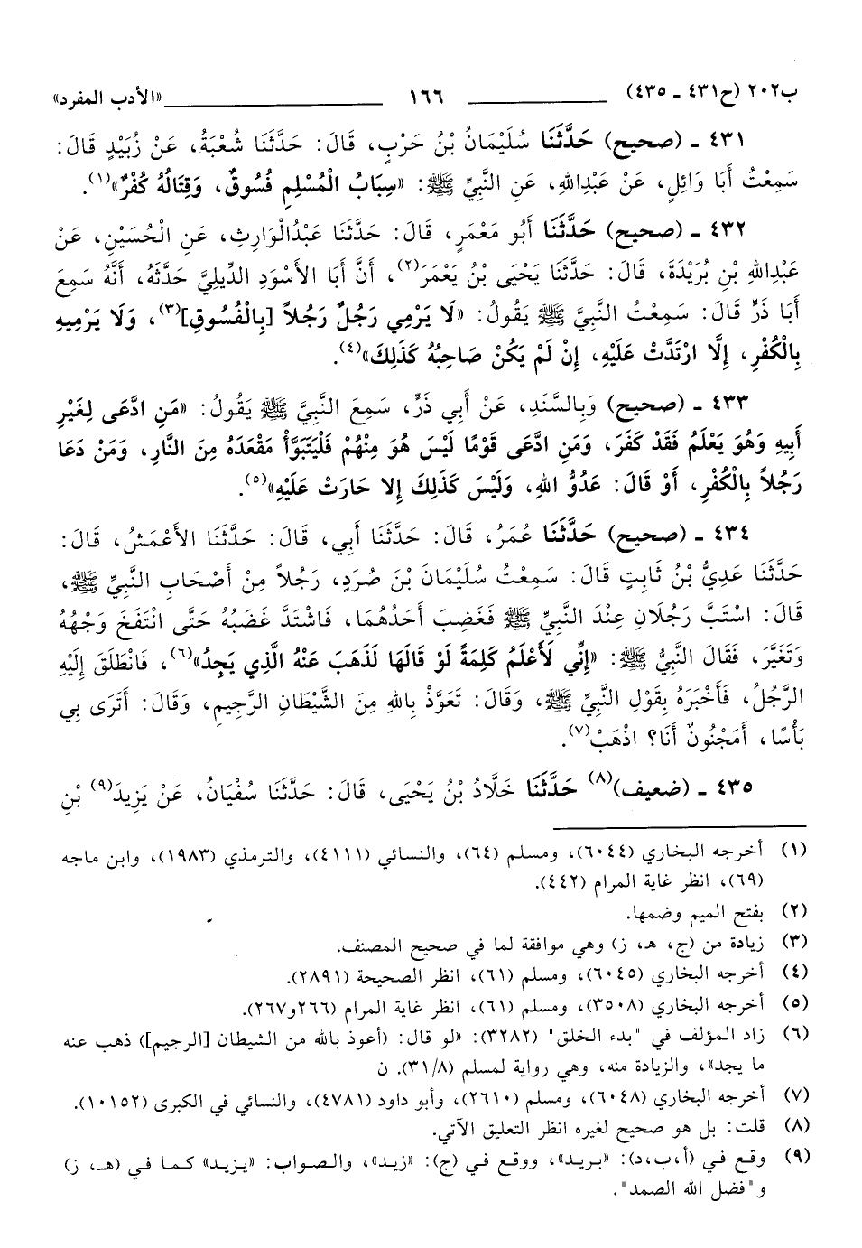 431 - حَدَّثَنَا سُلَيْمَانُ بْنُ حَرْبٍ، قَالَ: حَدَّثَنَا شُعْبَةُ، عَنْ زُبَيْدٍ, قَالَ: سَمِعْتُ أَبَا وَائِلٍ، عَنْ عَبْدِ اللهِ، عَنِ النَّبِيِّ صَلَّى اللهُ عَلَيهِ وَسَلَّمَ: سِبَابُ الْمُسْلِمِ فُسُوقٌ، وَقِتَالُهُ كُفْرٌ.