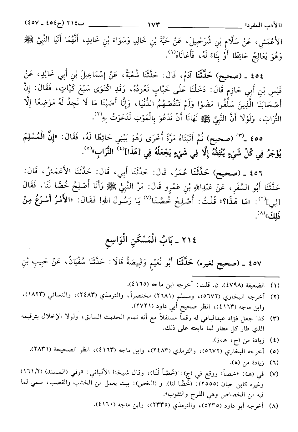 455 - ثُمَّ أَتَيْنَاهُ مَرَّةً أُخْرَى، وَهُوَ يَبْنِي حَائِطًا لَهُ، فَقَالَ: إِنَّ الْمُسْلِمَ يُؤْجَرُ فِي كُلِّ شَيْءٍ يُنْفِقُهُ, إِلاَّ فِي شَيْءٍ يَجْعَلُهُ فِي هَذَا التُّرَابِ.
