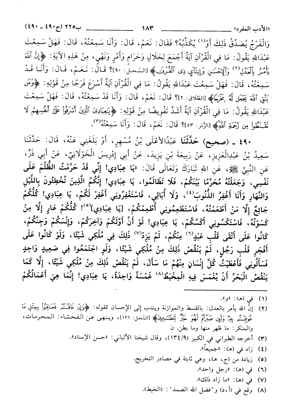 490 - حَدَّثَنَا عَبْدُ الأعْلَى بْنُ مُسْهِرٍ، أَوْ بَلَغَنِي عَنْهُ، قَالَ: حَدَّثَنَا سَعِيدُ بْنُ عَبْدِ الْعَزِيزِ، عَنْ رَبِيعَةَ بْنِ يَزِيدَ، عَنْ أَبِي إِدْرِيسَ الْخَوْلاَنِيِّ، عَنْ أَبِي ذَرٍّ، عَنِ النَّبِيِّ صَلَّى اللهُ عَلَيهِ وَسَلَّمَ، عَنِ اللهِ تَبَارَكَ وَتَعَالَى, قَالَ: يَا عِبَادِي، إِنِّي قَدْ حَرَّمْتُ الظُّلْمَ عَلَى نَفْسِي، وَجَعَلْتُهُ مُحَرَّمًا بَيْنَكُمْ فَلاَ تَظَالَمُوا، يَا عِبَادِي، إِنَّكُمُ الَّذِينَ تُخْطِئُونَ بِاللَّيْلِ وَالنَّهَارِ, وَأَنَا أَغْفِرُ الذُّنُوبَ، وَلاَ أُبَالِي، فَاسْتَغْفِرُونِي أَغْفِرْ لَكُمْ، يَا عِبَادِي، كُلُّكُمْ جَائِعٌ إِلاَّ مَنْ أَطْعَمْتُهُ، فَاسْتَطْعِمُونِي أُطْعِمْكُمْ، يَا عِبَادِي، كُلُّكُمْ عَارٍ إِلاَّ مِنْ كَسَوْتُهُ، فَاسْتَكْسُونِي أَكْسُكُمْ، يَا عِبَادِي، لَوْ أَنَّ أَوَّلَكُمْ وَآخِرَكُمْ، وَإِنْسَكُمْ وَجِنَّكُمْ، كَانُوا عَلَى أَتْقَى قَلْبِ عَبْدٍ مِنْكُمْ، لَمْ يَزِدْ ذَلِكَ فِي مُلْكِي شَيْئًا، وَلَوْ كَانُوا عَلَى أَفْجَرِ قَلْبِ رَجُلٍ، لَمْ يَنْقُصْ ذَلِكَ مِنْ مُلْكِي شَيْئًا، وَلَوِ اجْتَمَعُوا فِي صَعِيدٍ وَاحِدٍ فَسَأَلُونِي فَأَعْطَيْتُ كُلَّ إِنْسَانٍ مِنْهُمْ مَا سَأَلَ، لَمْ يَنْقُصْ ذَلِكَ مِنْ مُلْكِي شَيْئًا، إِلاَّ كَمَا يَنْقُصُ الْبَحْرُ أَنْ يُغْمَسَ فِيهِ الْمِخْيَطُ غَمْسَةً وَاحِدَةً، يَا عِبَادِي، إِنَّمَا هِيَ أَعْمَالُكُمْ أَحْفَظُهَا عَلَيْكُمْ، فَمَنْ وَجَدَ خَيْرًا فَلْيَحْمَدِ اللهَ، وَمَنْ وَجَدَ غَيْرَ ذَلِكَ فَلاَ يَلُومَ (1) إِلاَّ نَفْسَهُ.
