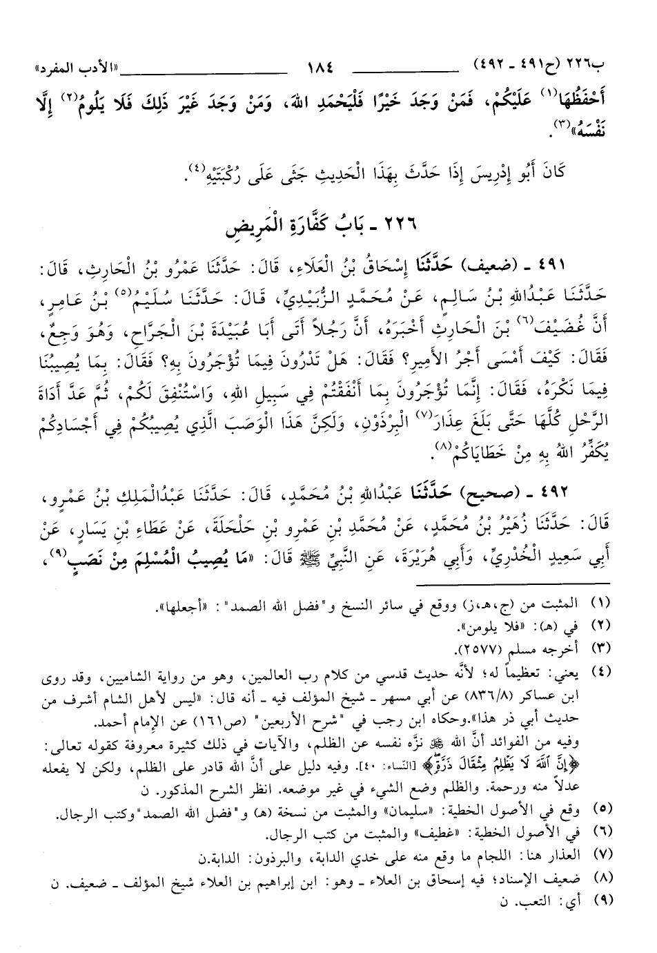 491 - حَدَّثَنَا إِسْحَاقُ بْنُ الْعَلاَءِ، قَالَ: حَدَّثَنَا عَمْرُو بْنُ الْحَارِثِ، قَالَ: حَدَّثَنَا عَبْدُ اللهِ بْنُ سَالِمٍ، عَنْ مُحَمَّدٍ الزُّبَيْدِيِّ، قَالَ: حَدَّثَنَا سُلَيْمُ بْنُ عَامِرٍ، أَنَّ غضيف (1) بْنَ الْحَارِثِ أَخْبَرَهُ، أَنَّ رَجُلاً أَتَى أَبَا عُبَيْدَةَ بْنَ الْجَرَّاحِ، وَهُوَ وَجِعٌ، فَقَالَ: كَيْفَ أَمْسَى أَجْرُ الأَمِيرِ؟ فَقَالَ: هَلْ تَدْرُونَ فِيمَا تُؤْجَرُونَ بِهِ؟ فَقَالَ: بِمَا يُصِيبُنَا فِيمَا نَكْرَهُ، فَقَالَ: إِنَّمَا تُؤْجَرُونَ بِمَا أَنْفَقْتُمْ فِي سَبِيلِ اللهِ، وَاسْتُنْفِقَ لَكُمْ، ثُمَّ عَدَّ أدَاة الرحل (2) كُلَّهَا, حَتَّى بلغ عذار الْبَرْذَوْنِ (3)، وَلَكِنَّ هَذَا الْوَصَبَ الَّذِي يُصِيبُكُمْ فِي أَجْسَامِكُمْ يُكَفِّرُ اللهُ بِهِ مِنْ خَطَايَاكُمْ.