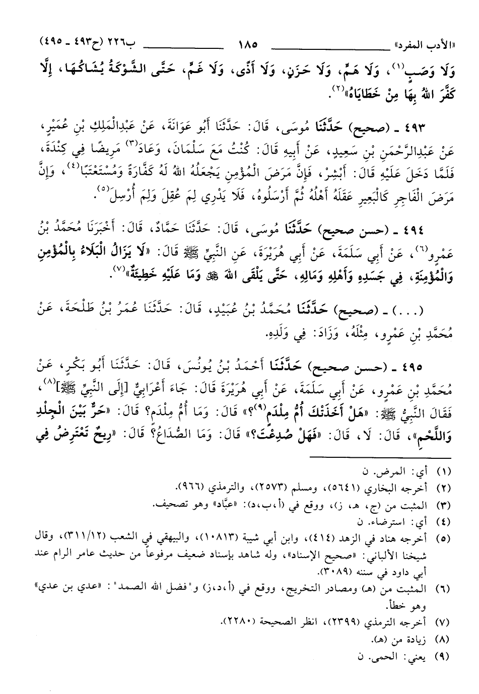 494 - حَدَّثَنَا مُوسَى، قَالَ: حَدَّثَنَا حَمَّادٌ، قَالَ: أَخْبَرَنَا مُحَمَّدُ بْنُ عَمْرٍو (1)، عَنْ أَبِي سَلَمَةَ، عَنْ أَبِي هُرَيْرَةَ، عَنِ النَّبِيِّ صَلَّى اللهُ عَلَيهِ وَسَلَّمَ قَالَ: لاَ يَزَالُ الْبَلاَءُ بِالْمُؤْمِنِ وَالْمُؤْمِنَةِ، فِي جَسَدِهِ وَأَهْلِهِ وَمَالِهِ، حَتَّى يَلْقَى اللهَ عَزَّ وَجَلَّ وَمَا عَلَيْهِ خَطِيئَةٌ.