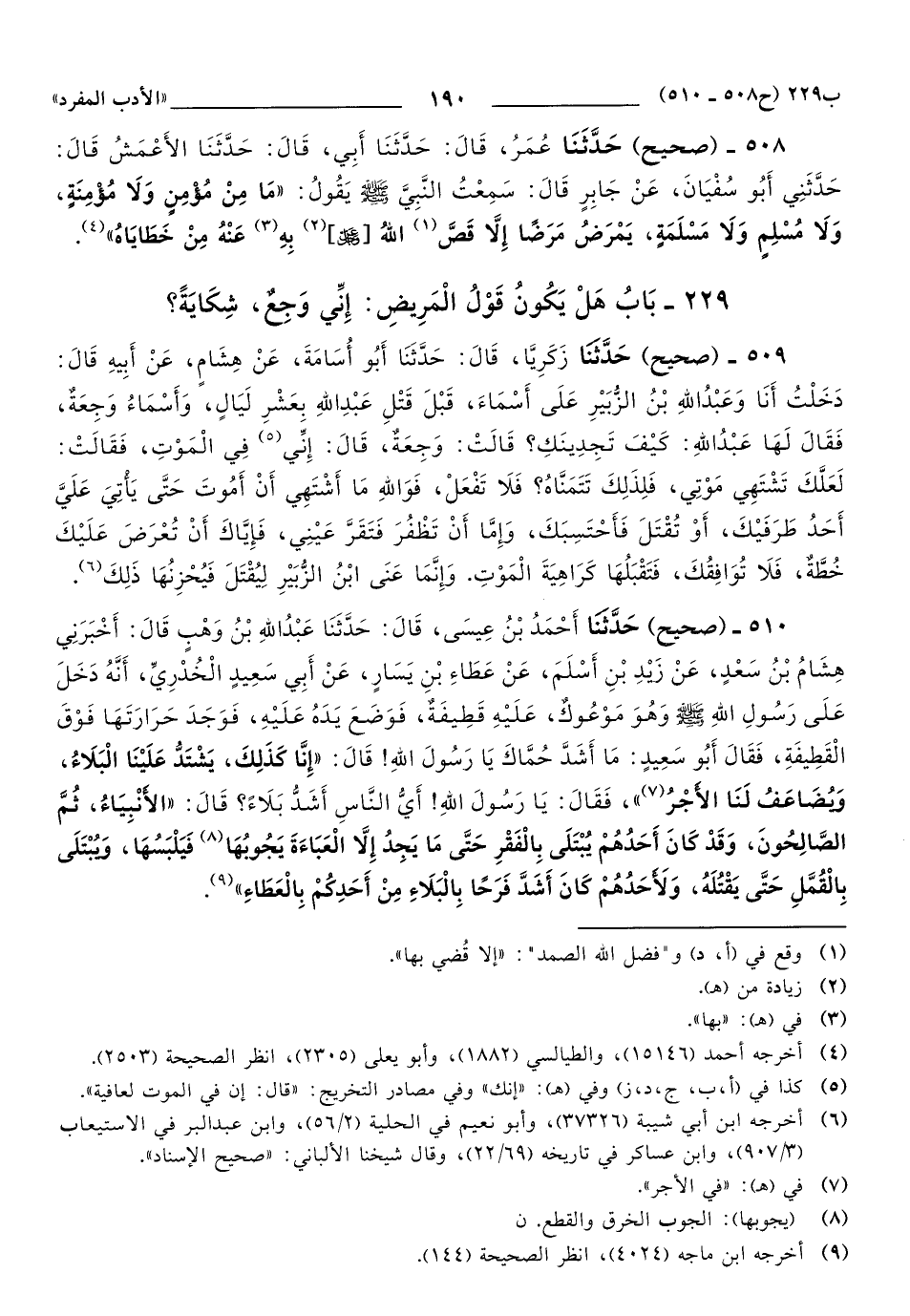 509 - حَدَّثَنَا زَكَرِيَّا، قَالَ: حَدَّثَنَا أَبُو أُسَامَةَ، عَنْ هِشَامٍ، عَنْ أَبِيهِ, قَالَ: دَخَلْتُ أَنَا وَعَبْدُ اللهِ بْنُ الزُّبَيْرِ عَلَى أَسْمَاءَ، قَبْلَ قَتْلِ عَبْدِ اللهِ بِعَشْرِ لَيَالٍ، وَأَسْمَاءُ وَجِعَةٌ، فَقَالَ لَهَا عَبْدُ اللهِ: كَيْفَ تَجِدِينَكِ؟ قَالَتْ: وَجِعَةٌ، قَالَ: إِنِّي فِي الْمَوْتِ، فَقَالَتْ: لَعَلَّكَ تَشْتَهِي مَوْتِي، فَلِذَلِكَ تَتَمَنَّاهُ؟ فَلاَ تَفْعَلْ، فَوَاللَّهِ مَا أَشْتَهِي أَنْ أَمُوتَ حَتَّى يأتي عَلَى أَحَدِ طرفيك (1)، أو تُقْتَلَ فَأَحْتَسِبُكَ، وَإِمَّا أَنْ تَظْفُرَ فَتَقَرَّ عَيْنِي، فَإِيَّاكَ أَنْ تُعْرَضَ عَلَيْكَ خُطَّةٌ، فَلاَ تُوَافِقُكَ، فَتَقْبَلُهَا كَرَاهِيَةَ الْمَوْتِ.