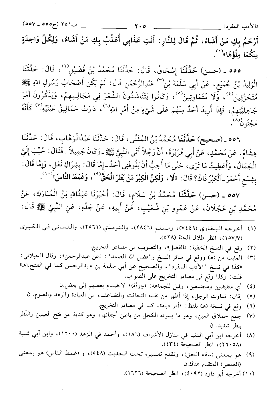 556 - حَدَّثَنَا مُحَمَّدُ بْنُ الْمُثَنَّى، قَالَ: حَدَّثَنَا عَبْدُ الْوَهَّابِ، قَالَ: حَدَّثَنَا هِشَامٌ، عَنْ مُحَمَّدٍ، عَنْ أَبِي هُرَيْرَةَ، أَنَّ رَجُلاً أَتَى النَّبِيَّ صَلَّى اللهُ عَلَيهِ وَسَلَّمَ، -وَكَانَ جَمِيلاً-، فَقَالَ: حُبِّبَ إِلَيَّ الْجَمَالُ، وَأُعْطِيتُ مَا تَرَى، حَتَّى مَا أُحِبُّ أَنْ يَفُوقَنِي أَحَدٌ (1)، -إِمَّا قَالَ: بِشِرَاكِ نَعْلٍ، أَوْ قَالَ: بِشِسْعٍ أَحْمَرَ-، آلْكِبْرِ (2) ذَاكَ؟ قَالَ: لاَ، وَلَكِنَّ الْكِبْرَ مَنْ بَطَرَ الْحَقَّ، وَغَمِطَ النَّاسَ.