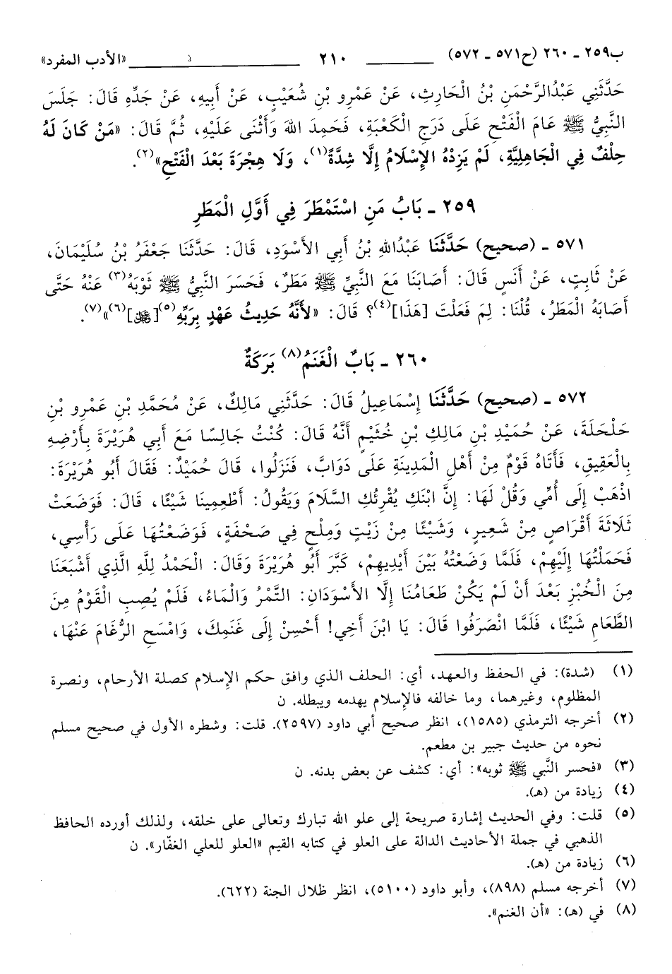 572 - حَدَّثَنَا إِسْمَاعِيلُ, قَالَ: حَدَّثَنِي مَالِكٌ، عَنْ مُحَمَّدِ بْنِ عَمْرِو بْنِ حَلْحَلَةَ، عَنْ حُمَيْدِ بْنِ مَالِكِ بْنِ خُثَيْمٍ, أَنَّهُ قَالَ: كُنْتُ جَالِسًا مَعَ أَبِي هُرَيْرَةَ بِأَرْضِهِ بِالْعَقِيقِ، فَأَتَاهُ قَوْمٌ مِنْ أَهْلِ الْمَدِينَةِ عَلَى دَوَابَّ، فَنَزَلُوا، قَالَ حُمَيْدٌ: فَقَالَ أَبُو هُرَيْرَةَ: اذْهَبْ إِلَى أُمِّي وَقُلْ لَهَا: إِنَّ ابْنَكِ يُقْرِئُكِ السَّلاَمَ وَيَقُولُ: أَطْعِمِينَا شَيْئًا، قَالَ: فَوَضَعَتْ ثَلاَثَةَ أَقْرَاصٍ مِنْ شَعِيرٍ، وَشَيْئًا مِنْ زَيْتٍ وَمِلْحٍ فِي صَحْفَةٍ، فَوَضَعْتُهَا عَلَى رَأْسِي، فَحَمَلْتُهَا إِلَيْهِمْ، فَلَمَّا وَضَعْتُهُ بَيْنَ أَيْدِيهِمْ، كَبَّرَ أَبُو هُرَيْرَةَ, وَقَالَ: الْحَمْدُ لِلَّهِ الَّذِي أَشْبَعَنَا مِنَ الْخُبْزِ بَعْدَ أَنْ لَمْ يَكُنْ طَعَامُنَا إِلاَّ الأَسْوَدَانِ: التَّمْرُ وَالْمَاءُ، فَلَمْ يُصِبِ الْقَوْمُ مِنَ الطَّعَامِ شَيْئًا، فَلَمَّا انْصَرَفُوا, قَالَ: يَا ابْنَ أَخِي، أَحْسِنْ إِلَى غَنَمِكَ، وَامْسَحْ الرُّغَامَ عَنْهَا، وَأَطِبْ مُرَاحَهَا، وَصَلِّ فِي نَاحِيَتِهَا، فَإِنَّهَا مِنْ دَوَابِّ الْجَنَّةِ، وَالَّذِي نَفْسِي بِيَدِهِ, لَيُوشِكُ أَنْ يَأْتِيَ عَلَى النَّاسِ زَمَانٌ تَكُونُ الثُّلَّةُ مِنَ الْغَنَمِ أَحَبَّ إِلَى صَاحِبِهَا مِنْ دَارِ مَرْوَانَ.