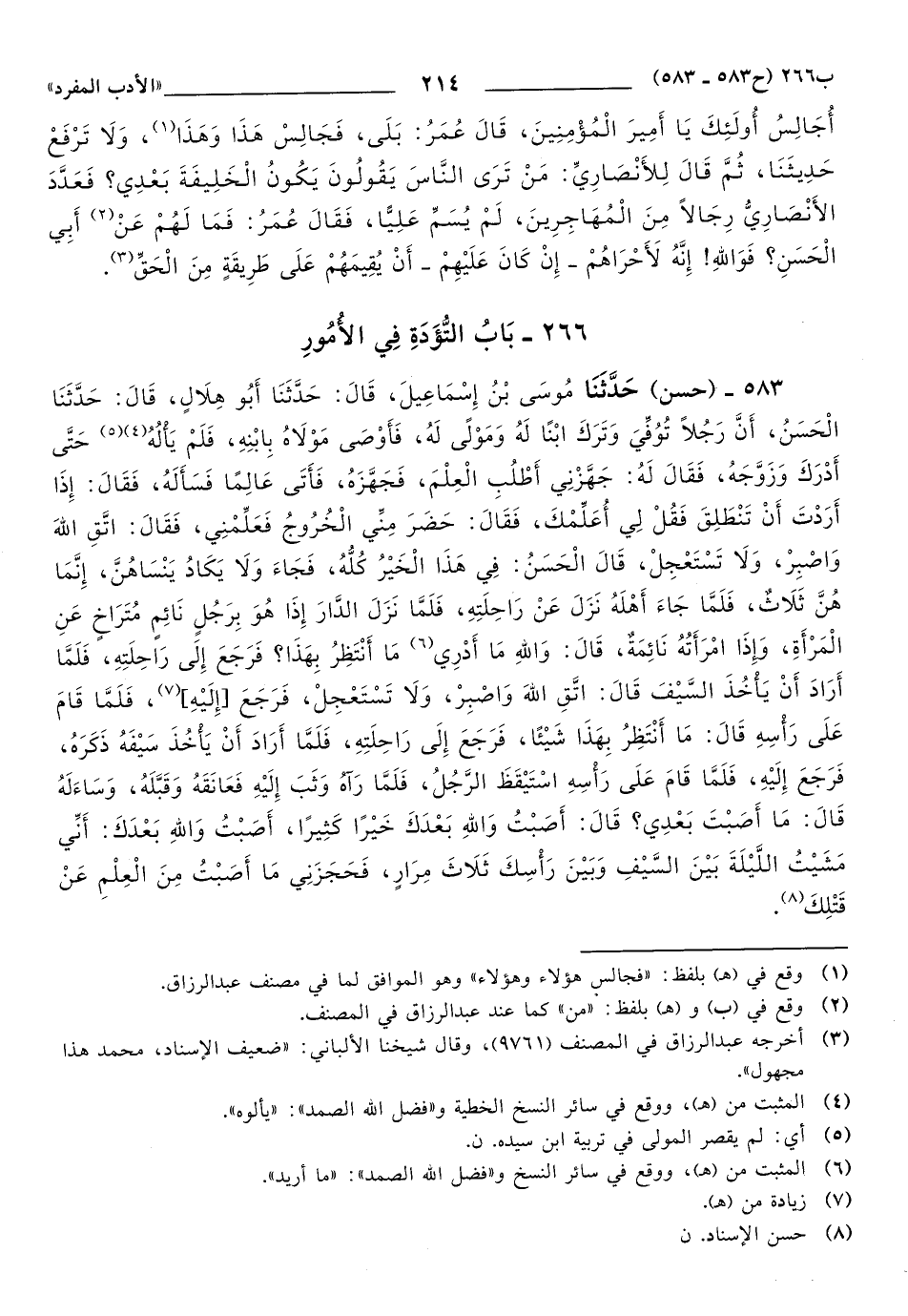 583 - حَدَّثَنَا مُوسَى بْنُ إِسْمَاعِيلَ، قَالَ: حَدَّثَنَا أَبُو هِلاَلٍ، قَالَ: حَدَّثَنَا الْحَسَنُ، أَنَّ رَجُلاً تُوُفِّيَ وَتَرَكَ ابْنًا لَهُ, وَمَوْلًى لَهُ، فَأَوْصَى مَوْلاَهُ بِابْنِهِ، فَلَمْ يَأْلُهُ حَتَّى أَدْرَكَ وَزَوَّجَهُ، فَقَالَ لَهُ: جَهَّزْنِي أَطْلُبِ الْعِلْمَ، فَجَهَّزَهُ، فَأَتَى عَالِمًا فَسَأَلَهُ، فَقَالَ: إِذَا أَرَدْتَ أَنْ تَنْطَلِقَ فَقُلْ لِي أُعَلِّمْكَ، فَقَالَ: حَضَرَ مِنِّي الْخُرُوجُ فَعَلِّمْنِي، فَقَالَ: اتَّقِ اللهَ وَاصْبِرْ، وَلاَ تَسْتَعْجِلْ، قَالَ الْحَسَنُ: فِي هَذَا الْخَيْرُ كُلُّهُ، فَجَاءَ وَلاَ يَكَادُ يَنْسَاهُنَّ، إِنَّمَا هُنَّ ثَلاَثٌ، فَلَمَّا جَاءَ أَهْلَهُ نَزَلَ عَنْ رَاحِلَتِهِ، فَلَمَّا نَزَلَ الدَّارَ إِذَا هُوَ بِرَجُلٍ نَائِمٍ مُتَرَاخٍ عَنِ الْمَرْأَةِ، وَإِذَا امْرَأَتُهُ نَائِمَةٌ، قَالَ: وَاللَّهِ مَا أَدْرِي مَا أنْتَظَرَ بِهَذَا؟ فَرَجَعَ إِلَى رَاحِلَتِهِ، فَلَمَّا أَرَادَ أَنْ يَأْخُذَ السَّيْفَ, قَالَ: اتَّقِ اللهَ وَاصْبِرْ، وَلاَ تَسْتَعْجِلْ، فَرَجَعَ إِلَيْهِ، فَلَمَّا قَامَ عَلَى رَأْسِهِ, قَالَ: مَا أَنْتَظِرُ بِهَذَا شَيْئًا، فَرَجَعَ إِلَى رَاحِلَتِهِ، فَلَمَّا أَرَادَ أَنْ يَأْخُذَ سَيْفَهُ ذَكَرَهُ، فَرَجَعَ إِلَيْهِ، فَلَمَّا قَامَ عَلَى رَأْسِهِ اسْتَيْقَظَ الرَّجُلُ، فَلَمَّا رَآهُ وَثَبَ إِلَيْهِ فَعَانَقَهُ وَقَبَّلَهُ، وَسَاءَلَهُ, قَالَ: مَا أَصَبْتَ بَعْدِي؟ قَالَ: أَصَبْتُ وَاللَّهِ بَعْدَكَ خَيْرًا كَثِيرًا، أَصَبْتُ وَاللَّهِ بَعْدَكَ: أَنِّي مَشَيْتُ اللَّيْلَةَ بَيْنَ السَّيْفِ وَبَيْنَ رَأْسِكَ ثَلاَثَ مِرَارٍ، فَحَجَزَنِي مَا أَصَبْتُ مِنَ الْعِلْمِ عَنْ قَتْلِكَ.