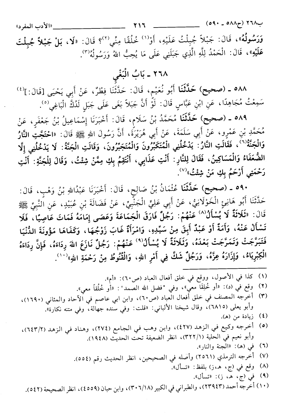 590 - حَدَّثَنَا عُثْمَانُ بْنُ صَالِحٍ، قَالَ: أَخْبَرَنَا عَبْدُ اللهِ بْنُ وَهْبٍ، قَالَ: حَدَّثَنَا أَبُو هَانِئٍ الْخَوْلاَنِيُّ، عَنْ أَبِي عَلِيٍّ الْجَنْبِيِّ، عَنْ فَضَالَةَ بْنِ عُبَيْدٍ، عَنِ النَّبِيِّ صَلَّى اللهُ عَلَيهِ وَسَلَّمَ قَالَ: ثَلاَثَةٌ لاَ تَسْأَل عَنْهُمْ: رَجُلٌ فَارَقَ الْجَمَاعَةَ وَعَصَى إِمَامَهُ فَمَاتَ عَاصِيًا، فَلاَ تَسْأَلْ عَنْهُ، وَأَمَةٌ أَوْ عَبْدٌ أَبِقَ مِنْ سَيِّدِهِ، وَامْرَأَةٌ غَابَ زَوْجُهَا، وَكَفَاهَا مَؤُونَةَ الدُّنْيَا فَتَبَرَّجَتْ وَتَمَرَّجَتْ بَعْدَهُ، وَثَلاَثَةٌ لاَ يُسْأَلُ عَنْهُمْ: رَجُلٌ نَازَعَ اللهَ رِدَاءَهُ، فَإِنَّ رِدَاءَهُ الْكِبْرِيَاءُ، وَإِزَارَهُ عِزَّهُ، وَرَجُلٌ شَكَّ فِي أَمْرِ اللهِ، وَالْقَنوط مِنْ رَحْمَةِ اللهِ.