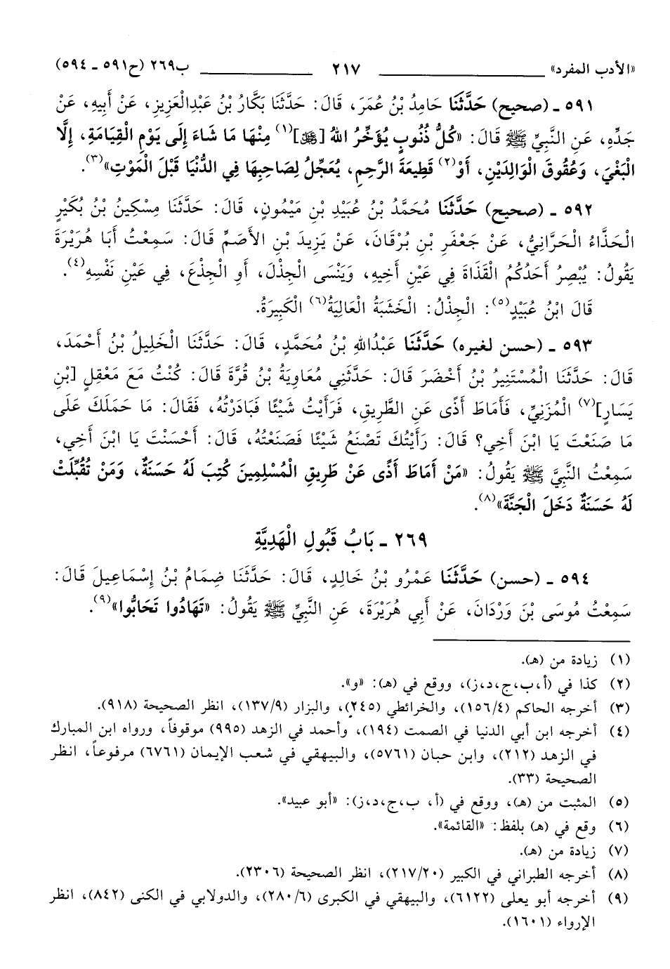 591 - حَدَّثَنَا حَامِدُ بْنُ عُمَرَ، قَالَ: حَدَّثَنَا بَكَّارُ بْنُ عَبْدِ الْعَزِيزِ، عَنْ أَبِيهِ، عَنْ جَدِّهِ، عَنِ النَّبِيِّ صَلَّى اللهُ عَلَيهِ وَسَلَّمَ قَالَ: كُلُّ ذُنُوبٍ يُؤَخِّرُ اللهُ [عز وجل] (1) مِنْهَا مَا شَاءَ إِلَى يَوْمِ الْقِيَامَةِ، إِلاَّ الْبَغْيَ، وَعُقُوقَ الْوَالِدَيْنِ، أَوْ قَطِيعَةَ الرَّحِمِ، يُعَجِّلُ لِصَاحِبِهَا فِي الدُّنْيَا قَبْلَ الْمَوْتِ.
