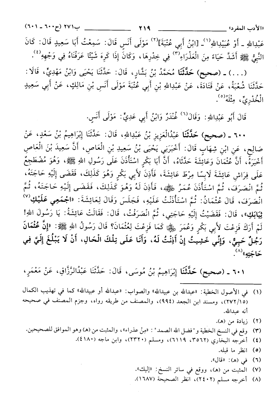 600 - حَدَّثَنَا عَبْدُ الْعَزِيزِ بْنُ عَبْدِ اللهِ، قَالَ: حَدَّثَنَا إِبْرَاهِيمُ بْنُ سَعْدٍ، عَنْ صَالِحٍ، عَنِ ابْنِ شِهَابٍ, قَالَ: أَخْبَرَنِي يَحْيَى بْنُ سَعِيدِ بْنِ الْعَاصِ، أَنَّ سَعِيدَ بْنَ الْعَاصِ أَخْبَرَهُ، أَنَّ عُثْمَانَ وَعَائِشَةَ، حَدَّثَاهُ، أَنَّ أَبَا بَكْرٍ اسْتَأْذَنَ عَلَى رَسُولِ اللهِ صَلَّى اللهُ عَلَيهِ وَسَلَّمَ، وَهُوَ مُضْطَجِعٌ عَلَى فِرَاشِ عَائِشَةَ, لاَبِسًا مِرْطَ عَائِشَةَ، فَأَذِنَ لأَبِي بَكْرٍ وَهُوَ كَذَلِكَ، فَقَضَى إِلَيْهِ حَاجَتَهُ، ثُمَّ انْصَرَفَ، ثُمَّ اسْتَأْذَنَ عُمَرُ رَضِيَ اللهُ عَنْهُ، فَأَذِنَ لَهُ وَهُوَ كَذَلِكَ، فَقَضَى إِلَيْهِ حَاجَتَهُ، ثُمَّ انْصَرَفَ، قَالَ عُثْمَانُ: ثُمَّ اسْتَأْذَنْتُ عَلَيْهِ، فَجَلَسَ, وَقَالَ لِعَائِشَةَ: اجْمَعِي عليك (1) ثِيَابَكِ، قَالَ: فَقَضَيْتُ إِلَيْهِ حَاجَتِي، ثُمَّ انْصَرَفْتُ، قَالَ: فَقَالَتْ عَائِشَةُ: يَا رَسُولَ اللهِ!، لَمْ أَرَكَ فَزِعْتَ لأَبِي بَكْرٍ وَعُمَرَ رَضِيَ اللهُ عَنْهُمَا كَمَا فَزِعْتَ لِعُثْمَانَ؟ قَالَ رَسُولُ اللهِ صَلَّى اللهُ عَلَيهِ وَسَلَّمَ: إِنَّ عُثْمَانَ رَجُلٌ حَيِيٌّ، وَإِنِّي خَشِيتُ إِنْ أَذِنْتُ لَهُ، وَأَنَا عَلَى تِلْكَ الْحَالِ، أَنْ لاَ يَبْلُغَ إِلَيَّ فِي حَاجَتِهِ.