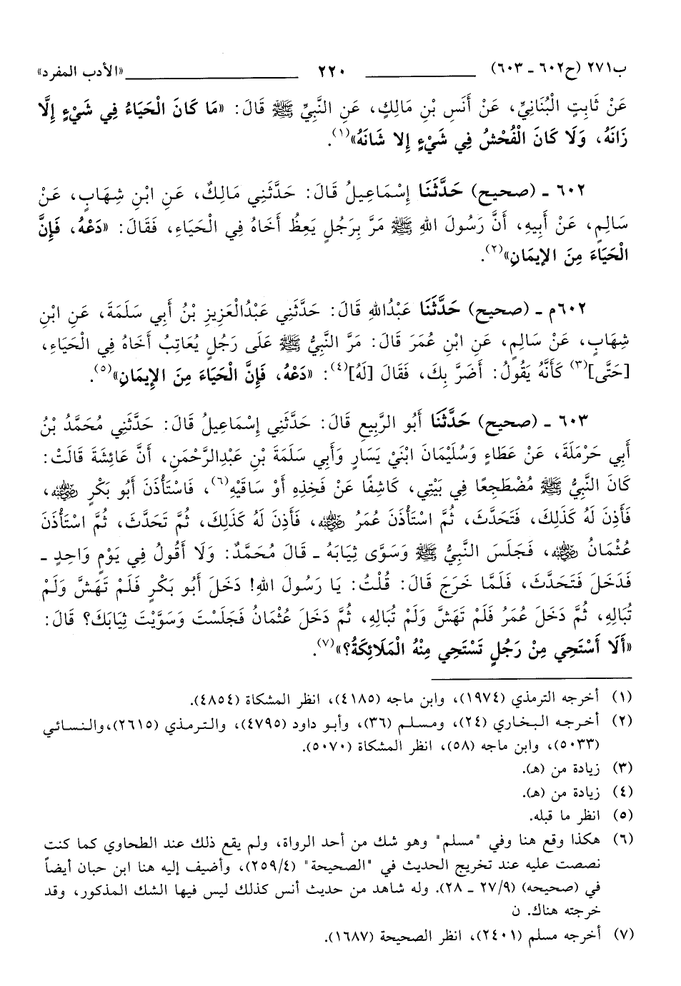 602م- حَدَّثَنَا عَبْدُ اللهِ, قَالَ: حَدَّثَنِي عَبْدُ الْعَزِيزِ بْنُ أَبِي سَلَمَةَ، عَنِ ابْنِ شِهَابٍ، عَنْ سَالِمٍ، عَنِ ابْنِ عُمَرَ, قَالَ: مَرَّ النَّبِيُّ صَلَّى اللهُ عَلَيهِ وَسَلَّمَ عَلَى رَجُلٍ يُعَاتِبُ أَخَاهُ فِي الْحَيَاءِ، حَتَّى كَأَنَّهُ يَقُولُ: أَضَرَّ بِكَ، فَقَالَ لَهُ (صَلَّى اللهُ عَلَيهِ وَسَلَّمَ) (1): دَعْهُ، فَإِنَّ الْحَيَاءَ مِنَ الإِيمَانِ.