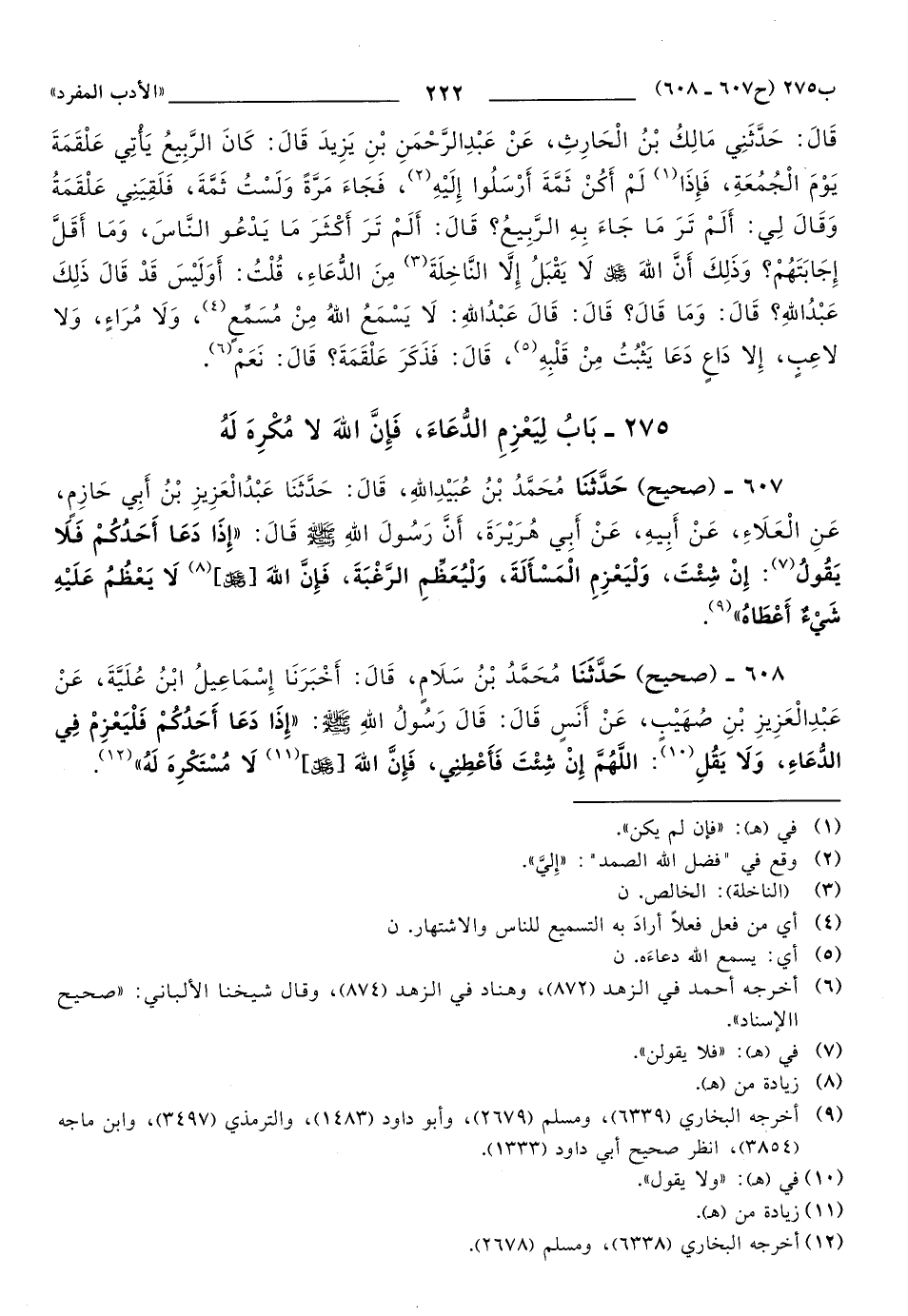 607 - حَدَّثَنَا مُحَمَّدُ بْنُ عُبَيْدِ اللهِ، قَالَ: حَدَّثَنَا عَبْدُ الْعَزِيزِ بْنُ أَبِي حَازِمٍ، عَنِ الْعَلاَءِ، عَنْ أَبِيهِ، عَنْ أَبِي هُرَيْرَةَ، أَنَّ رَسُولَ اللهِ صَلَّى اللهُ عَلَيهِ وَسَلَّمَ قَالَ: إِذَا دَعَا أَحَدُكُمْ فَلاَ يَقُول: إِنْ شِئْتَ، وَلْيَعْزِمِ الْمَسْأَلَةَ، وَلْيُعَظِّمِ الرَّغْبَةَ، فَإِنَّ اللهَ [عز وجل] (1) لاَ يَعْظُمُ عَلَيْهِ شَيْءٌ أَعْطَاهُ.