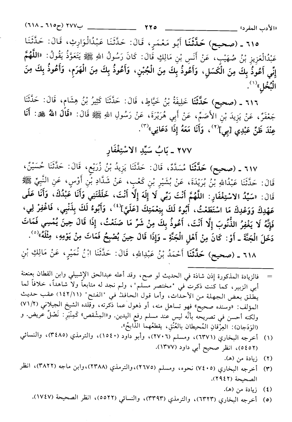 617 - حَدَّثَنَا مُسَدَّدٌ، قَالَ: حَدَّثَنَا يَزِيدُ بْنُ زُرَيْعٍ، قَالَ: حَدَّثَنَا حُسَيْنٌ، قَالَ: حَدَّثَنَا عَبْدُ اللهِ بْنُ بُرَيْدَةَ، عَنْ بُشَيْرِ بْنِ كَعْبٍ، عَنْ شَدَّادِ بْنِ أَوْسٍ، عَنِ النَّبِيِّ صَلَّى اللهُ عَلَيهِ وَسَلَّمَ قَالَ: سَيِّدُ الاسْتِغْفَارِ: اللَّهُمَّ أَنْتَ رَبِّي لاَ إِلَهَ إِلاَّ أَنْتَ، خَلَقْتَنِي وَأَنَا عَبْدُكَ، وَأَنَا عَلَى عَهْدِكَ وَوَعْدِكَ مَا اسْتَطَعْتُ، أَبُوءُ لَكَ بِنِعْمَتِكَ [علي] (1)، وَأَبُوءُ لَكَ بِذَنْبِي، فَاغْفِرْ لِي، فَإِنَّهُ لاَ يَغْفِرُ الذُّنُوبَ إِلاَّ أَنْتَ، أَعُوذُ بِكَ مِنْ شَرِّ مَا صَنَعْتُ، إِذَا قَالَ حِينَ يُمْسِي فَمَاتَ دَخَلَ الْجَنَّةَ، -أَوْ: كَانَ مِنْ أَهْلِ الْجَنَّةِ-، وَإِذَا قَالَ حِينَ يُصْبِحُ فَمَاتَ مِنْ يَوْمِهِ مِثْلَهُ.