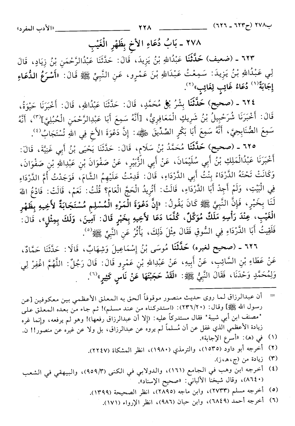 624 - حَدَّثَنَا بِشْرُ بْنُ مُحَمَّدٍ، قَالَ: حَدَّثَنَا عَبْدُ اللهِ، قَالَ: أَخْبَرَنَا حَيْوَةُ، قَالَ: أَخْبَرَنَا شُرَحْبِيلُ بْنُ شَرِيكٍ الْمَعَافِرِيُّ، أَنَّهُ سَمِعَ أَبَا عَبْدِ الرَّحْمَنِ الْحُبُلِيَّ، أنه سَمِعَ الصُّنَابِحِيَّ، أَنَّهُ سَمِعَ أَبَا بَكْرٍ الصِّدِّيقَ رَضِيَ اللهُ عَنْهُ: إِنَّ دَعْوَةَ الأَخِ فِي اللهِ تستجاب (1).