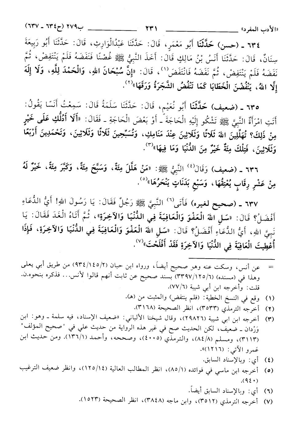 634 - حَدَّثَنَا أَبُو مَعْمَرٍ، قَالَ: حَدَّثَنَا عَبْدُ الْوَارِثِ، قَالَ: حَدَّثَنَا أَبُو رَبِيعَةَ سِنَانٌ,، قَالَ: حَدَّثَنَا أَنَسُ بْنُ مَالِكٍ, قَالَ: أَخَذَ النَّبِيُّ صَلَّى اللهُ عَلَيهِ وَسَلَّمَ غُصْنًا فَنَفَضَهُ فَلَمْ يَنْتَفِضْ، ثُمَّ نَفَضَهُ فَلَمْ يَنْتَفِضْ، ثُمَّ نَفَضَهُ فَانْتَفَضَ، قَالَ: إِنَّ سُبْحَانَ اللهِ، وَالْحَمْدَ لِلَّهِ، وَلاَ إِلَهَ إِلاَّ اللَّهُ، يَنْفُضْنَ الْخَطَايَا كَمَا تَنْفُضُ الشَّجَرَةُ وَرَقَهَا.