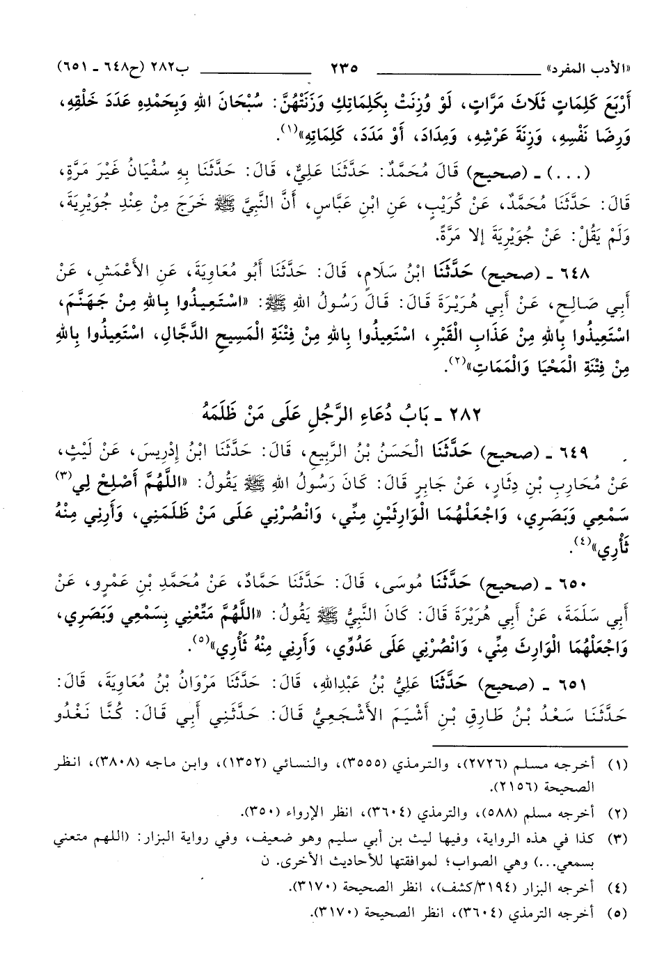 650 - حَدَّثَنَا مُوسَى، قَالَ: حَدَّثَنَا حَمَّادٌ، عَنْ مُحَمَّدِ بْنِ عَمْرٍو، عَنْ أَبِي سَلَمَةَ، عَنْ أَبِي هُرَيْرَةَ, قَالَ: كَانَ النَّبِيُّ صَلَّى اللهُ عَلَيهِ وَسَلَّمَ يَقُولُ: اللَّهُمَّ مَتِّعْنِي بِسَمْعِي وَبَصَرِي، وَاجْعَلْهُمَا الْوَارِثَ مِنِّي، وَانْصُرْنِي عَلَى عَدُوِّي، وَأَرِنِي مِنْهُ ثَأْرِي.