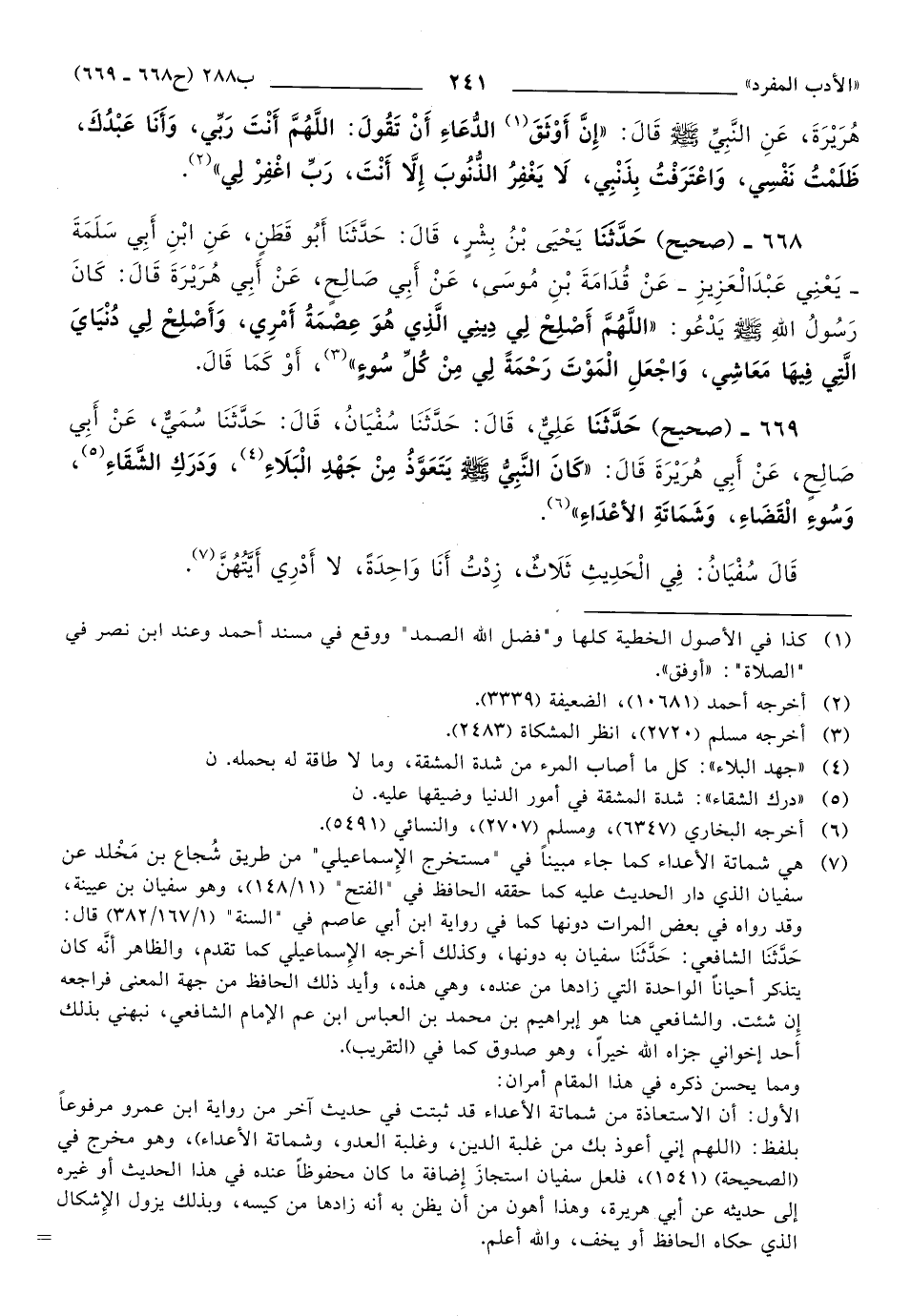 669 - حَدَّثَنَا عَلِيٌّ، قَالَ: حَدَّثَنَا سُفْيَانُ، قَالَ: حَدَّثَنَا سُمَيٌّ، عَنْ أَبِي صَالِحٍ، عَنْ أَبِي هُرَيْرَةَ, قَالَ: كَانَ النَّبِيُّ صَلَّى اللهُ عَلَيهِ وَسَلَّمَ يَتَعَوَّذُ مِنْ جَهْدِ الْبَلاَءِ، وَدَرَكِ الشَّقَاءِ، وَسُوءِ الْقَضَاءِ، وَشَمَاتَةِ الأعْدَاءِ.