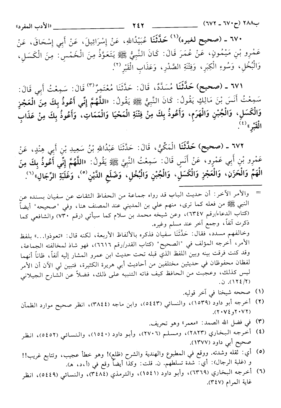 671 - حَدَّثَنَا مُسَدَّدٌ، قَالَ: حَدَّثَنَا مُعْتَمِرٌ, قَالَ: سَمِعْتُ أَبِي, قَالَ: سَمِعْتُ أَنَسَ بْنَ مَالِكٍ يَقُولُ: كَانَ النَّبِيُّ صَلَّى اللهُ عَلَيهِ وَسَلَّمَ يَقُولُ: اللَّهُمَّ إِنِّي أَعُوذُ بِكَ مِنَ الْعَجْزِ وَالْكَسَلِ، وَالْجُبْنِ وَالْهَرَمِ، وَأَعُوذُ بِكَ مِنْ فِتْنَةِ الْمَحْيَا وَالْمَمَاتِ، وَأَعُوذُ بِكَ مِنْ عَذَابِ الْقَبْرِ.