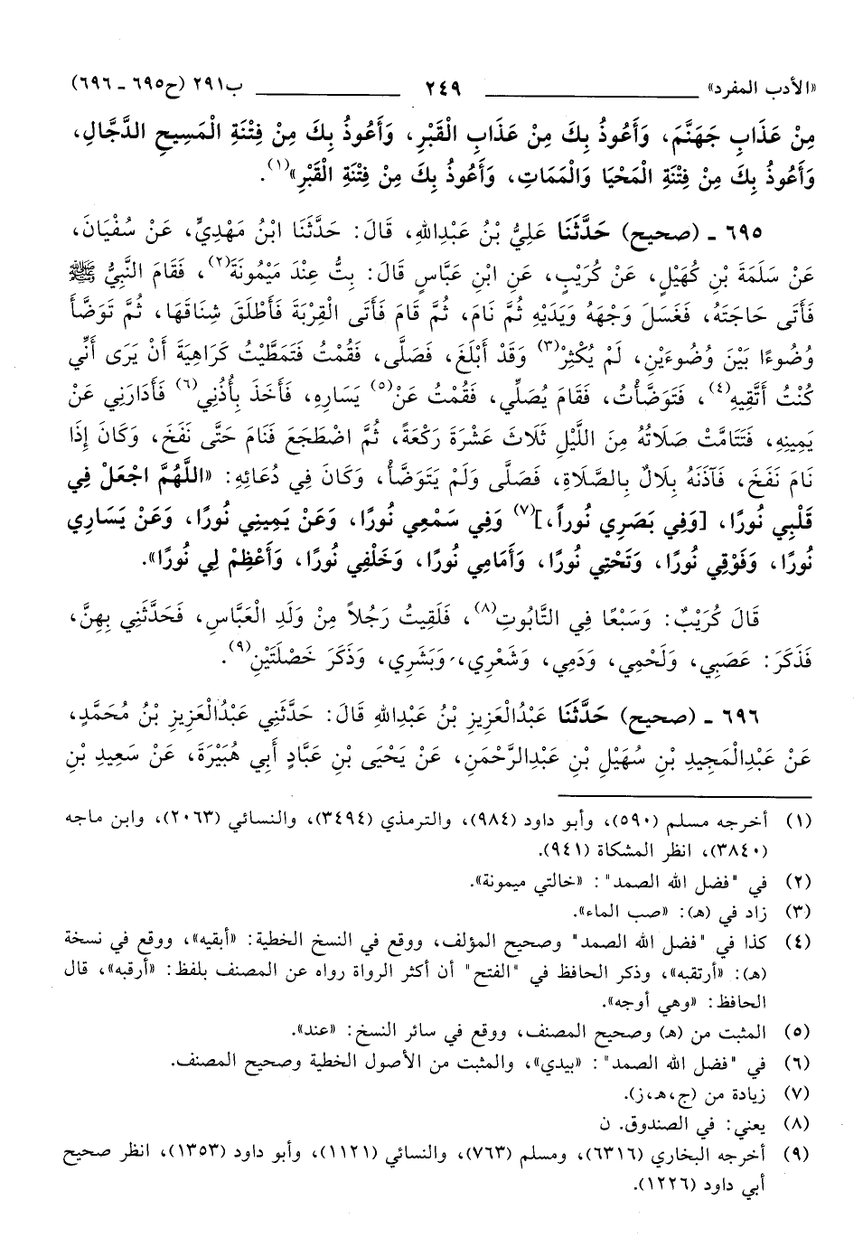 696 - حَدَّثَنَا عَبْدُ الْعَزِيزِ بْنُ عَبْدِ اللهِ, قَالَ: حَدَّثَنِي عَبْدُ الْعَزِيزِ بْنُ مُحَمَّدٍ، عَنْ عَبْدِ الْمَجِيدِ بْنِ سُهَيْلِ بْنِ عَبْدِ الرَّحْمَنِ، عَنْ يَحْيَى بْنِ عَبَّادٍ, أَبِي هُبَيْرَةَ، عَنْ سَعِيدِ بْنِ جُبَيْرٍ، عَنْ عَبْدِ اللهِ بْنِ عَبَّاسٍ, قَالَ: كَانَ النَّبِيُّ صَلَّى اللهُ عَلَيهِ وَسَلَّمَ إِذَا قَامَ مِنَ اللَّيْلِ، فَصَلَّى فَقَضَى صَلاَتَهُ، يُثْنِي عَلَى اللهِ [تبارك وتعالى] (1) بِمَا هُوَ أَهْلُهُ، ثُمَّ يَكُونُ فِي آخِرِ كَلاَمِهِ: اللَّهُمَّ اجْعَلْ لِي نُورًا فِي قَلْبِي، وَاجْعَلْ لِي نُورًا فِي سَمْعِي، وَاجْعَلْ لِي نُورًا فِي بَصَرِي، وَاجْعَلْ لِي نُورًا عَنْ يَمِينِي، وَنُورًا عَنْ شِمَالِي، وَاجْعَلْ لِي نُورًا مِنْ بَيْنَ يَدَيَّ، وَنُورًا مِنْ خَلْفِي، وَزِدْنِي نُورًا، وَزِدْنِي نُورًا، وَزِدْنِي نُورًا.